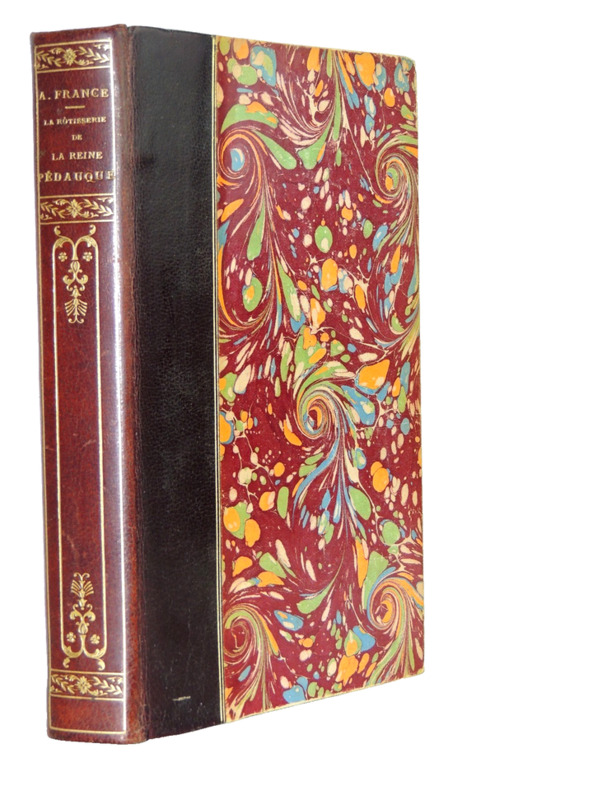 Jacques Ménétrier, dit Jacques Tournebroche à cause de la profession à laquelle l'a voué son rôtisseur de père, tient une librairie quand il entreprend de raconter ses aventures de jeunesse au XVIIIème siècle.C'est un roman picaresque plein de bouleversements, tragiques ou burlesques, au terme desquels un jeune homme, naguère ingénu, se trouve avoir fait son éducation morale. Mais La Rôtisserie de la reine Pédauque, tout en respectant les lois du genre, va plus loin et pose des questions essentielles sur le sens de la vie : les discussions philosophiques donnent au livre sa valeur d'inquiétude et d'apologie du désir. Ecrit en 1893, notre édition de 1925 revue et corrigée par l'auteur est établie dans une fine reliure en demi-chagrin brun sombre à coins, dos à quatre nerfs avec pavé titre et auteur en cuir brun clair, en bon état (légère insolation du dos, légers frottements en coins, aux coiffes et aux mors et qqes taches de décoloration). intérieur bien propre (pages légèrement jaunies).