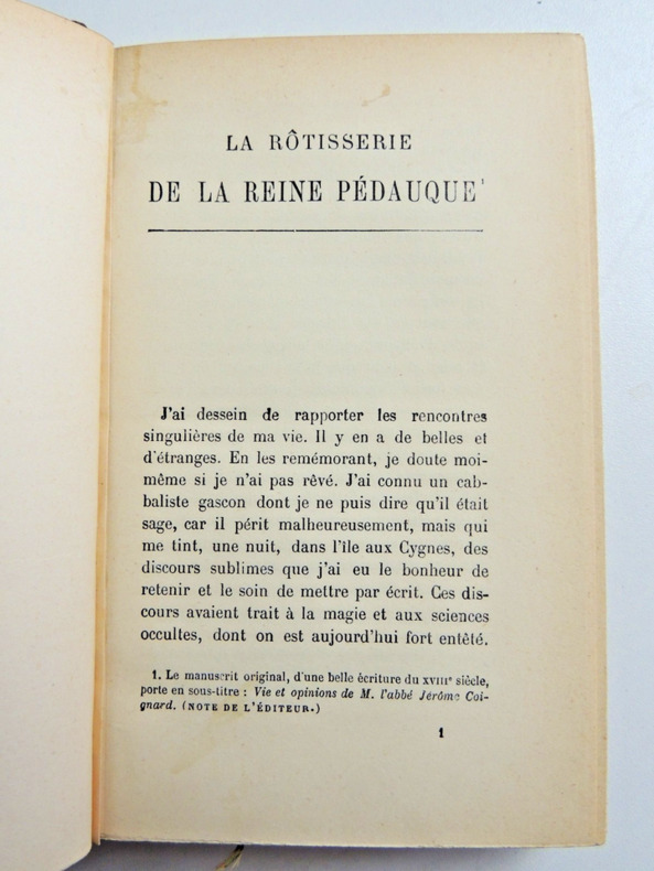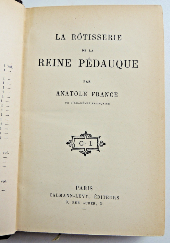 Imposant succès de l'auteur, La Rotisserie de la Reine Pédauque « la plus significative de ses oeuvres» est aussi celle de la maturité. À l'été, 1892, France, qui passe l'été avec sa fille Suzanne à Saint-Thomas, petite village de l'Aisne, termine cet imposant roman de plus de 600 pages. Le 10 août écri-il à un ami que sa reine Pédauque est «arrivé au 496° feuillet [...]. Le romancier a apporté son manuscrit dans sa valise ». En septembre, La Rotisserie est achevée et dès le 6 octobre elle commence à paraître en feuilletons dans L'Échos de Paris. Les origines du plus célèbre des romans de France puise allègrement dans les oeuvres les plus singulières du XVIIIe siècle, époque qui eût toujours sa préférence. Le personnage de l'abbé Coignard, le rôtisseur de la rue Saint-Jacques, maître Léonard et d'autres encore tout aussi savoureux ornent cette oeuvre qui inquiéta son auteur jusqu'à sa première publication. Le 5 octobre 1892, pris d'un doute affreux alors que L'Échos en publie les première pages, il écrit à sa confidente Madame de Caillavet «La Rôtisserie est toute à refaire. Je suis accablé...» Le 22 mars 1893 le texte paraît en volume chez Calmann Lévy. L'on sait la suite et son succès. Peu de titres dans la littérature de la fin du XIXe on connût un tel engouement, y compris bibliophilique. Outre les retirages nombreux et les éditions illustrées, les collectionneurs donnèrent aux plus grands ateliers cette Rotisserie qui fut admirablement et précieusement reliée. L'éditeur fit imprimée 20 japon et 40 hollande sous couverture orange - pour ne donner qu'un exemple citons celui de l'exemplaire du Bourg de Bozas sur japon relié par Meunier, assez dans le goût de l'époque. Il est amusant de noter enfin, que le libraire Conquet, avisé et prudent, à la suite de cet impressionnant succès, souscrivit auprès de l'éditeur à tous les futurs grands papiers des oeuvres de France. Le billet conservé dans cet exemplaire est adressé au poète algérianiste Albert Tustes (1888-1943). Il est l'auteur des Sirénéennes lauréat du grand Prix de l'Algérie en 1927.