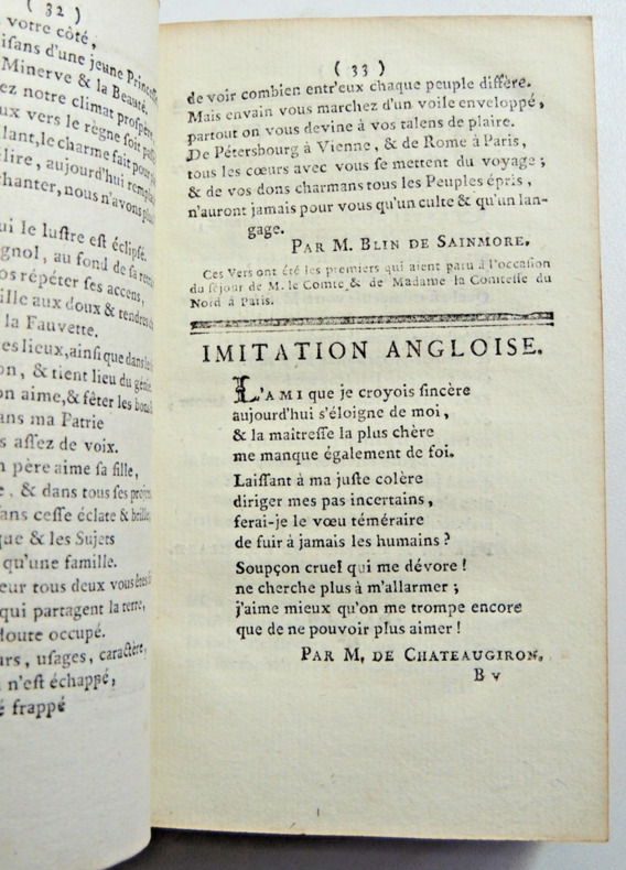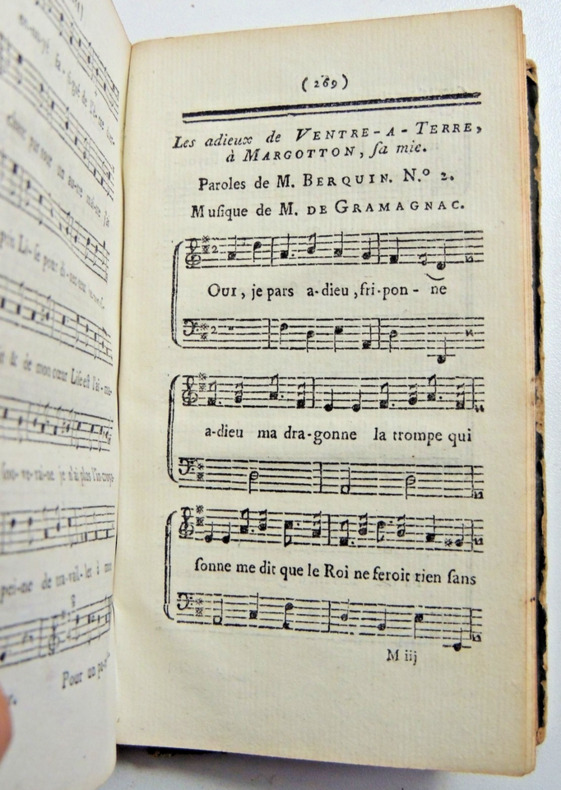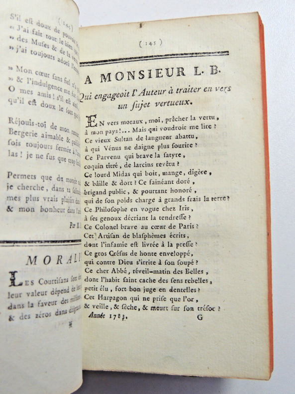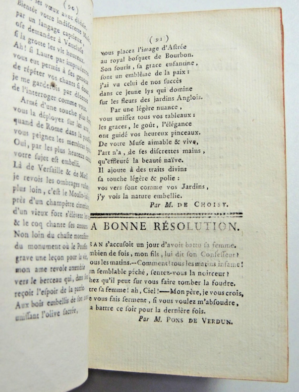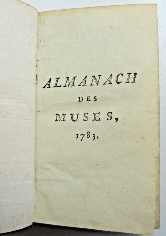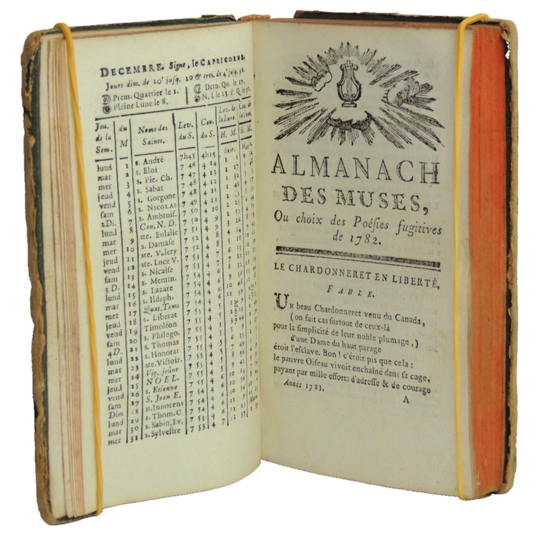 Cette année contient 166 pièces dont 20 sont anonymes. Auteurs: Berenger, Fréron, D'Hermitte-Maillane, Imbert, De Parny, Rivarol, Voltaire, Etc. Textes: Sur la Grande Chartreuse de Grenoble. - Le devin qui n'est pas sorcier. - Le remède pour la goutte. - Le danger de bailler. - La chartreuse de Paris. - Le cheval gris. - Éloge de la fièvre. - Sur la laitière de M. Greuze. - Le buveur raisonnable. - A madame Angélique Kauffmann, célèbre peintre. - Imitation de Pétrarque. - Etc... Contient une relation de voyage en montgolfière par un poème satirique sur Blanchard, sur son bateau volant ( pages 43-48 ) + 10 pages de notes musicales de chansons. vol in12, reliure demi cuir, accrocs, 14x8,5cm, frais, 276pp. ref/27/2