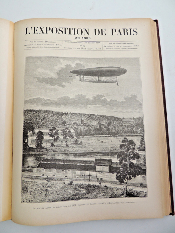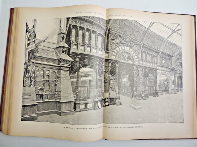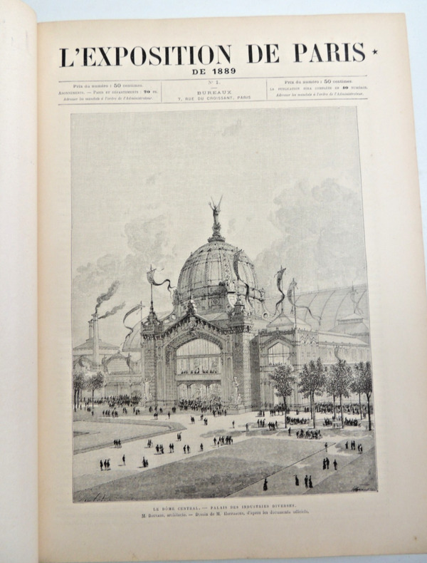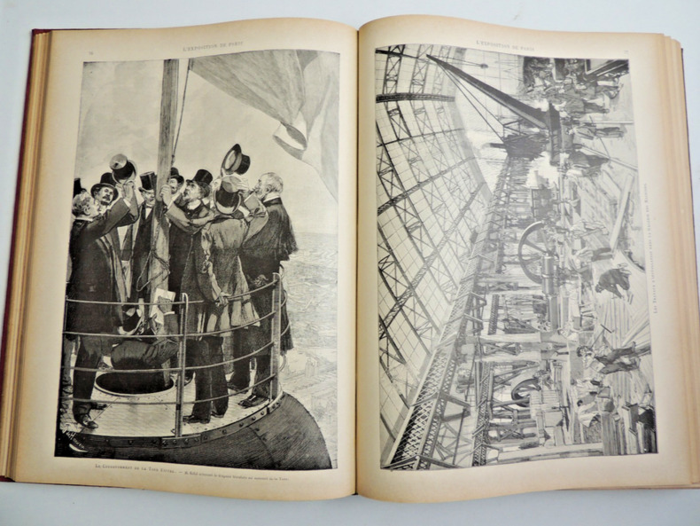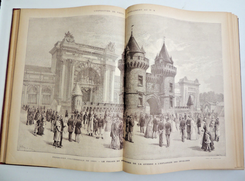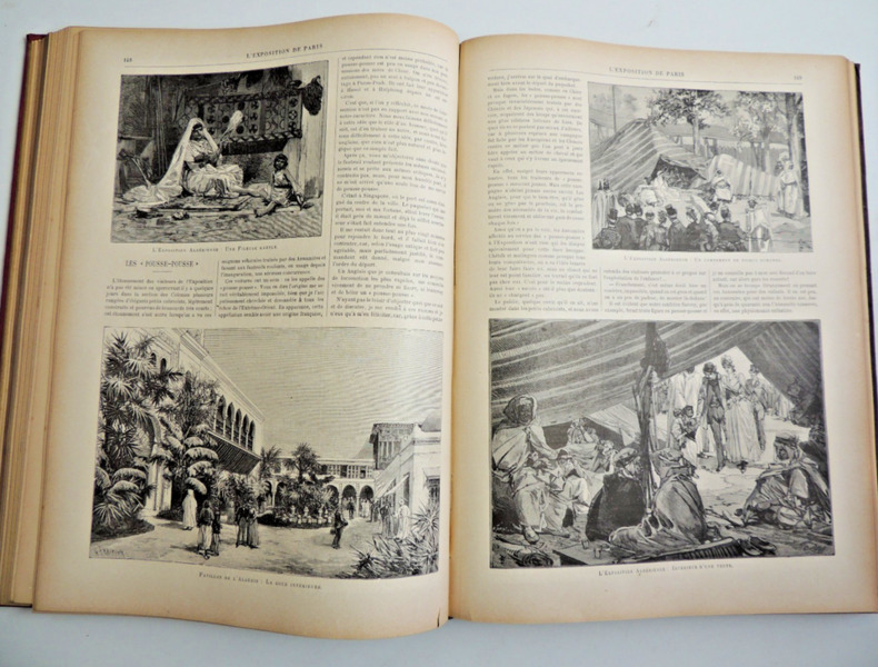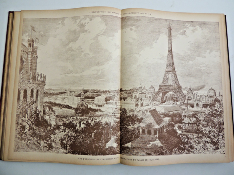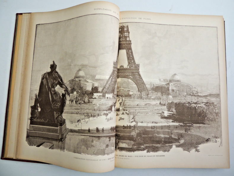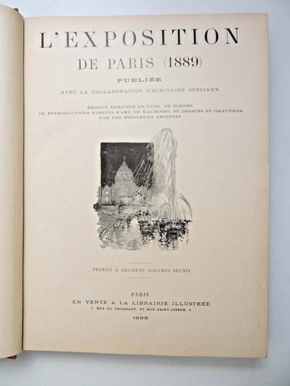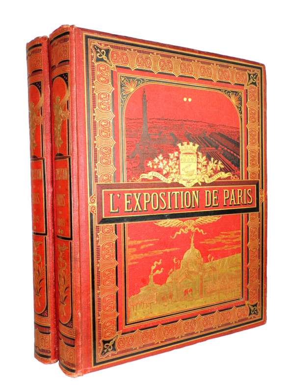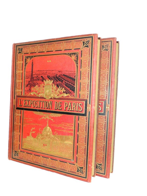 L'Exposition universelle de 1889 est la dixième exposition universelle organisée. Elle se tient à Paris du 5 mai au 31 octobre 1889. Son thème est la Révolution française, dans le cadre du centenaire de cet événement. C'est à l'occasion de cette exposition commémorative que la tour Eiffel est construite. Complet en 2 volumes in-folio, comprenant quatre tomes, 30x21cm, reliés cartonnages polychromes, petites usures, parfait état intérieur. 324, et 324 pages, imprimées sur 3 colonnes, soit 80 fascicules de 8 pages en pagination continue à chaque volume. Richement illustré de photos, reproductions, cartes et plans, dans, hors-texte, et souvent pleine page, ainsi que de grandes planches dépliantes rehaussées et signées de Robida, Redon, Courboin, Toussaint, etc. Très beaux exemplaires, poids 10kg Librairie Illustrée, 1889
