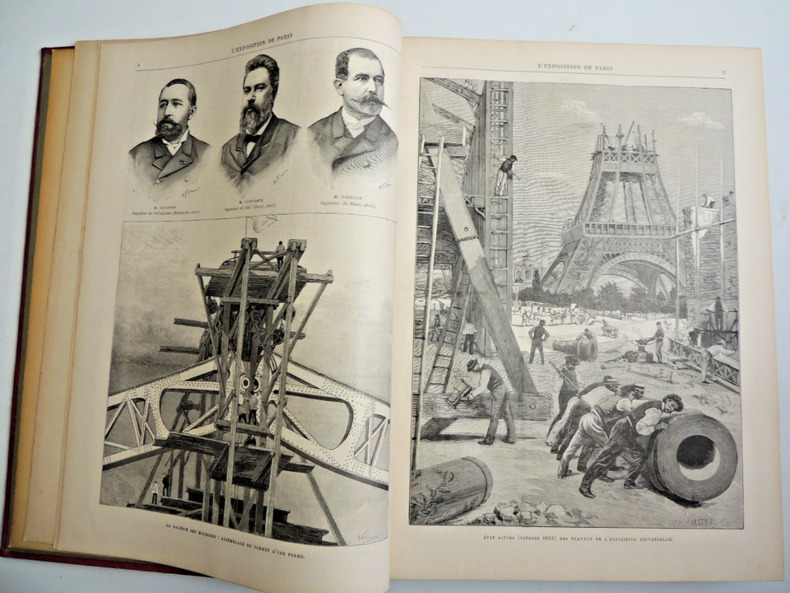 Complet des quatre tomes en 2 volumes in-folio.300x210, reliés demi cuir, petites usures de papier sur les plats, parfait état intérieur. 323 et 324 pages, imprimées sur 3 colonnes. 80 livraisons. Édition enrichie de vues, de scènes, de reproductions d'objet d'art, de machines, de dessins et gravures par les meilleurs artistes. Richement illustré de photos, reproductions, cartes et plans, dans, hors-texte, et souvent pleine page, ainsi que de grandes planches dépliantes rehaussées et signées. Paris, à la Librairie Illustrée, 1889.