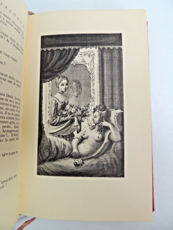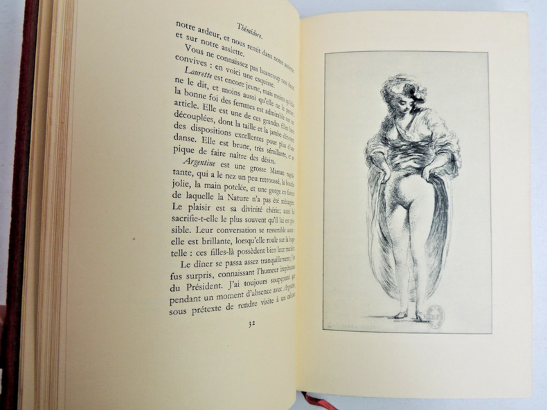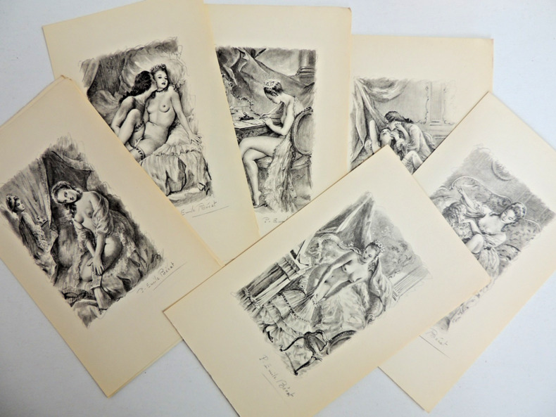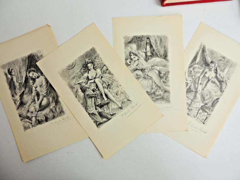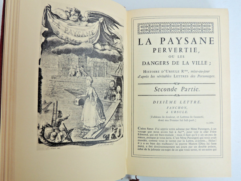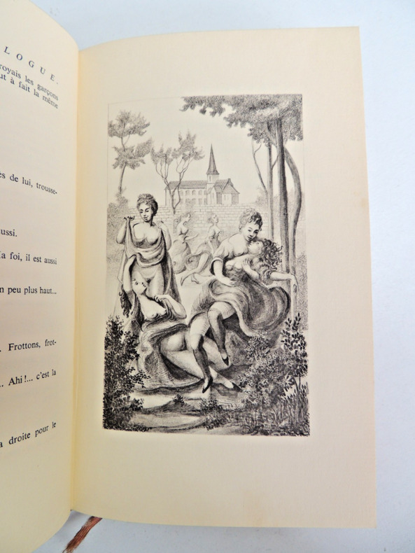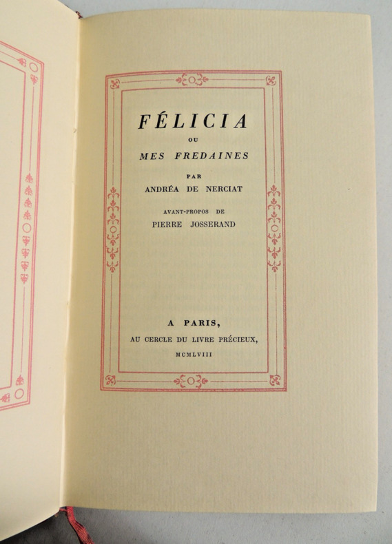 Rétif de la Bretonne, La paysanne pervertie ou les dangers de la ville, histoire d'Ursule R** mise au jour d'après les véritables lettres de personnages, 492pp, taches sur la couverture, Ex n°2135/3500 Andréa de Nerciat. Félicia ou mes fredaines, 321pp. Ex n°2343/3500 Tableaux des mœurs du temps dans les différens âges de la vie, préface de Roger Vailland, 265pp. Ex n°237/3500 Petit enfer poétique du XVIII° siècle, présenté par Henry Muller, 200pp. Ex n° 1648/3500 John Cleland, Mémoires de Fanny Hill, femme de plaisir, + carrière d'une pu..tain de Londres, par William Hogarth, non paginé, quelques taches sur la tranche, Ex n°2568/3500 Fougeret de Monbron, Margot la ravaudeuse, 254pp, Ex.n°2421/3500 Themidore ou histoire et celle de ma maitresse par Godard D'Aucour, 254pp, Ex n° 2314/3500 Crébillon, Lettres de la marquise de M*** au comte de R***. Avec une suite de 10 illustrations originales de Bécat, 213pp. Ex n° 2605/3500. Paris, Au cercle du livre Précieux 1958/1959