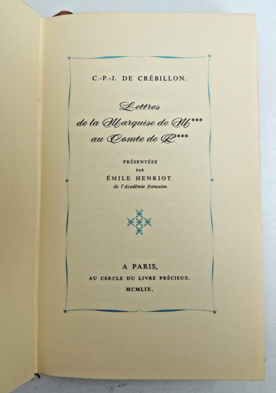 Collection Au cercle du livre précieux 8 volumes curiosa Chaque volume de cette série complète « XVIII° siècle » est numéroté et illustré. 8 volumes in-8°, 21x13, daim rouge, plats ornés, dos lisse orné, grille noire sans le cadenas (reliure de l'éditeur), ensemble en bel état avec usures d'usages.