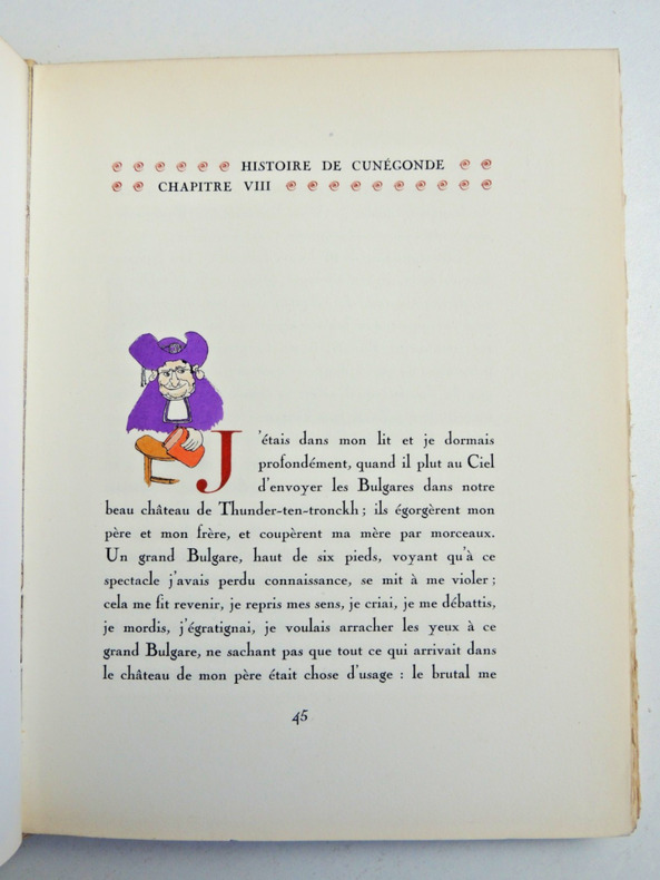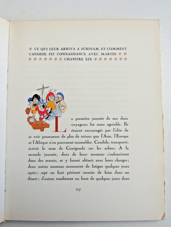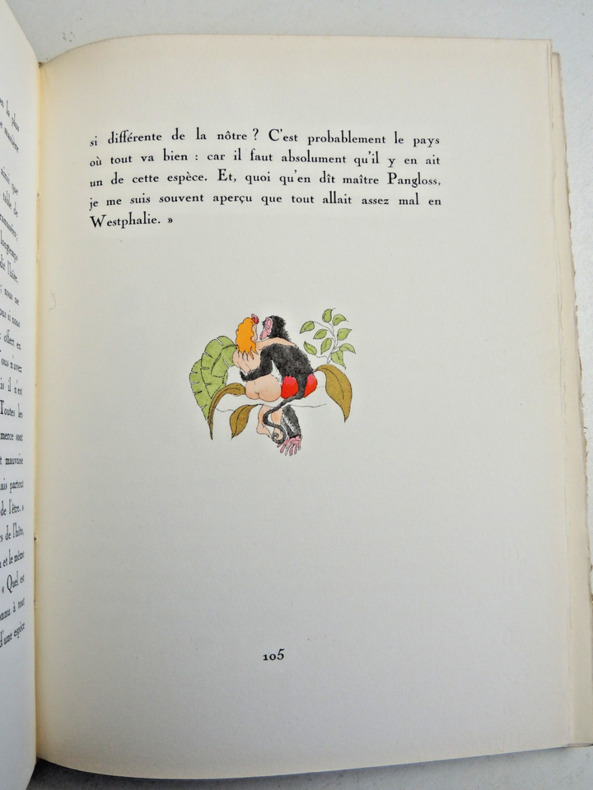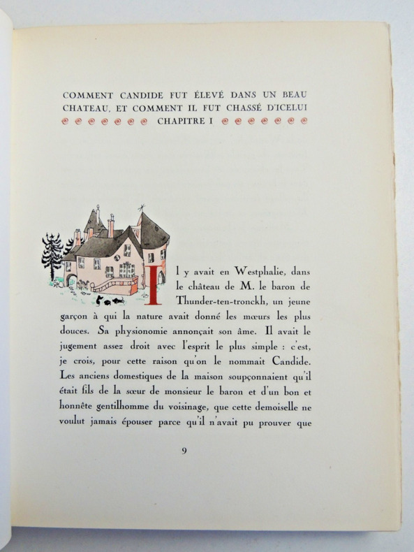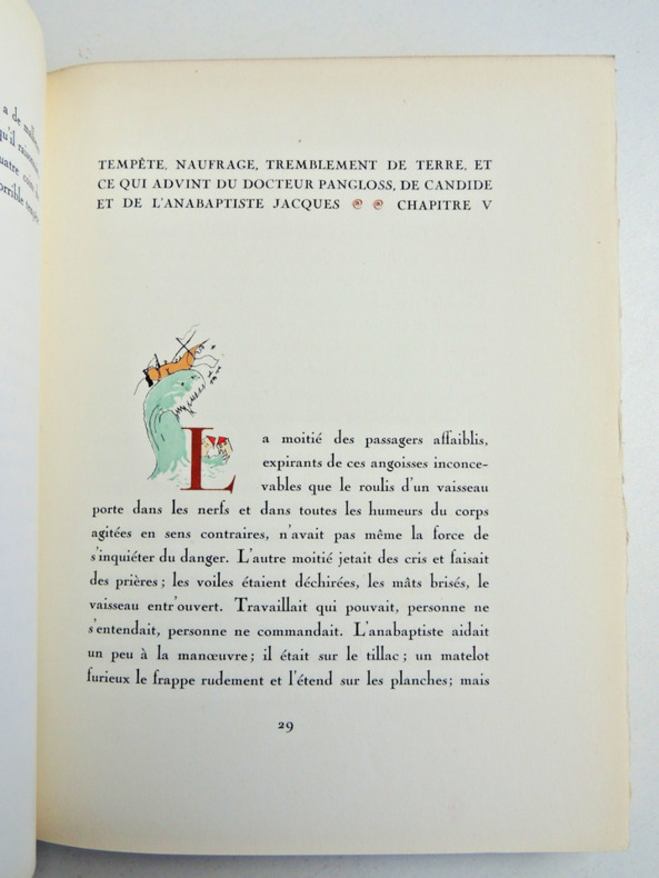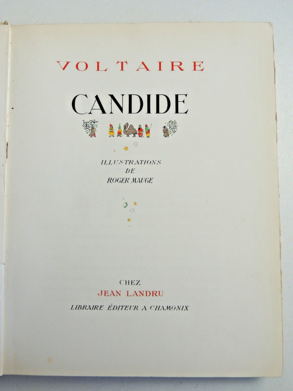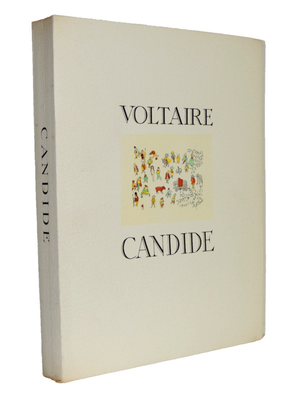 préface de Francisque Sarcey, illustrations de Adrien Moreau Candide est un conte philosophique. Il a pour personnage principal un jeune homme, Candide, qui vit dans un château avec sa cousine, Cunégonde, et son oncle. Il y est éduqué par un précepteur philosophe, Pangloss, qui suit la théorie de Leibniz, philosophe du XVIIe siècle, selon laquelle, notamment, « tout est pour le mieux dans le meilleur des mondes possibles ». Candide adhère d’abord à cette idée ; mais lorsque son oncle le chasse du château après l’avoir surpris en train d’embrasser Cunégonde, la vie va lui faire revoir cette opinion. Candide va en effet traverser une série de péripéties qui seront autant d’épreuves. Il se bat contre les Abares et découvre les horreurs de la guerre ; il assiste à la mort de milliers d’hommes et de femmes lors du tremblement de terre de Lisbonne ; il est condamné à mort injustement et en réchappe comme par miracle ; il découvre la manière cruelle dont sont traités les esclaves noirs, et finit par se réfugier en Turquie. Sur son chemin, il perd et retrouve tour à tour Pangloss et Cunégonde. A la fin du conte, ils vivent tous ensemble en Turquie et se contentent de « cultiver leur jardin », c’est-à-dire de s’occuper de leurs affaires privées sans plus se mêler du monde. « Il faut cultiver son jardin » est en effet le mot final du derviche, un mystique et sage de confession musulmane. Les principaux thèmes de cette œuvre sont ainsi le bonheur, la justice, l’ordre du monde et la politique. volume in-4, 255x170, jolie reliure, dos à nerfs, tranches de tête dorée, bel état intérieur, 174pp, couvertures d'origines conservées, coins lg. frottés, état intérieur neuf. Paris Jules Tallandier ( collection, " Les chefs d’œuvres de l'esprit " ), sans date, vers 1900 ref/241