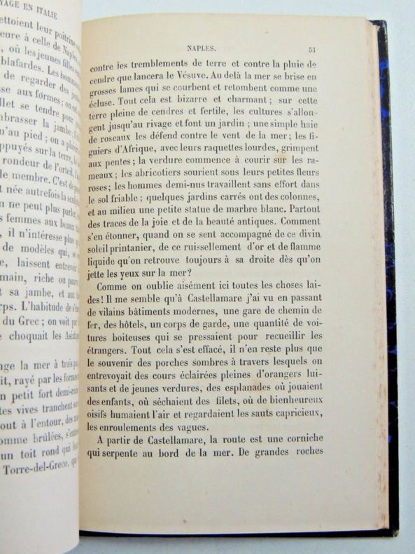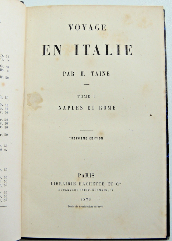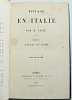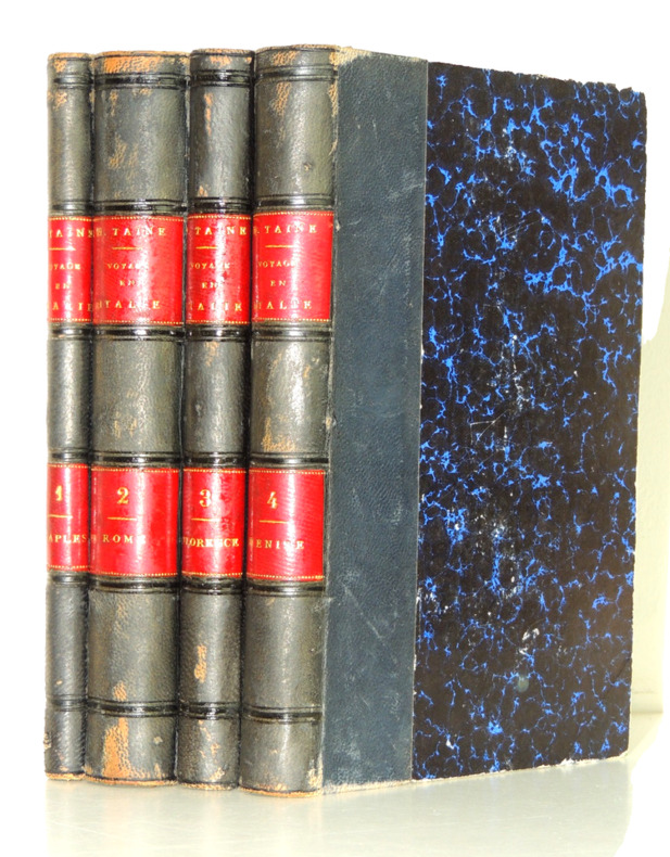 Table : Naples et Rome. La route et l'arrivée, Naples, De Naples à Rome, Les Antiques, La peinture, Les villas et les palais, Les églises, La société, La semaine sainte, Florence et Venise. Pérouse et Assise, Sienne et Pise, Florence, La peinture florentine, De Florence à Venise, Venise, La peinture vénitienne, La Lombardie. Italie. complet en 4 vols. reliés demi cuir, frottements, bel état intérieur, étiquette du relieur doreur A.Joubert Reims Tome I, 104pp, Naple et Rome Tome II, 413pp, Rome Tome III, 182pp, Florence Tome IV, 443pp, Venise Paris Hachette 1876 ref/14