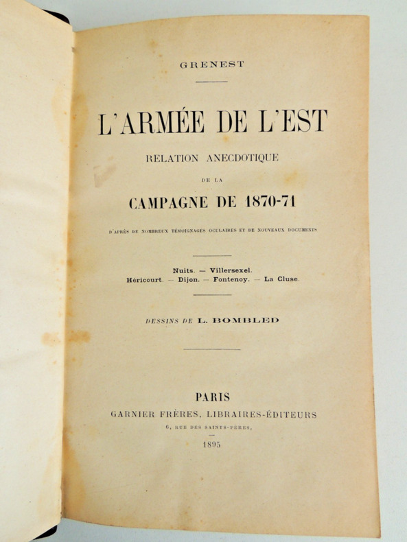 dessins de L. Bombled, cartes et plans. Table; Nuits, Villersexel, Héricourt, Dijon, Fontenoy, La Cluse vol relié, demi cuir, 22x14, bel état int., 588pp Paris, Garnier Frères, 1893 ref/13