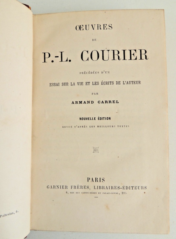 Pamphlets politiques - Pétition aux deux chambres 1816 - Lettres inédites écrites de France et d'Italie ( 1787 à 1812) - Pamphlets littéraires, etc.. vol. relié, 180x120, demi cuir, dos à nerfs, bel exemplaire, 583pp Paris, Garnier, vers 1860 ref/13