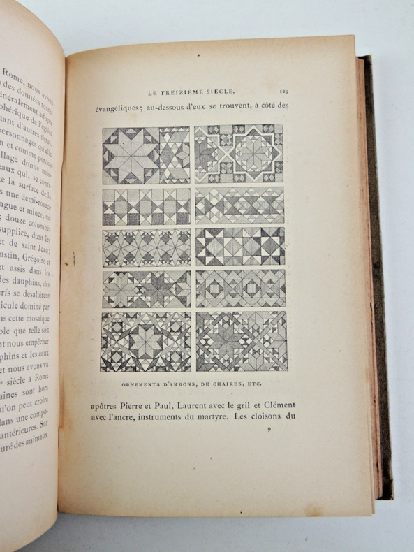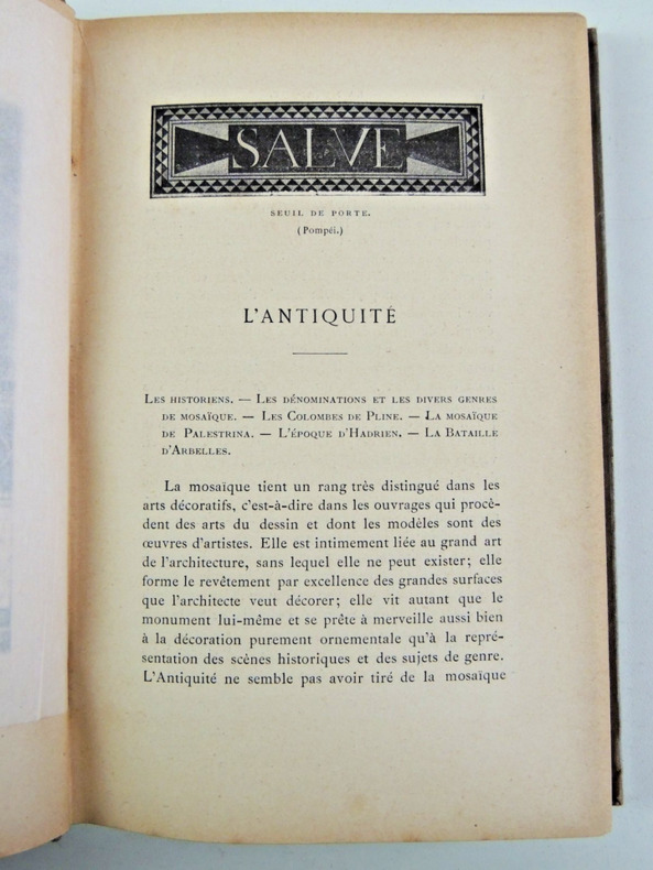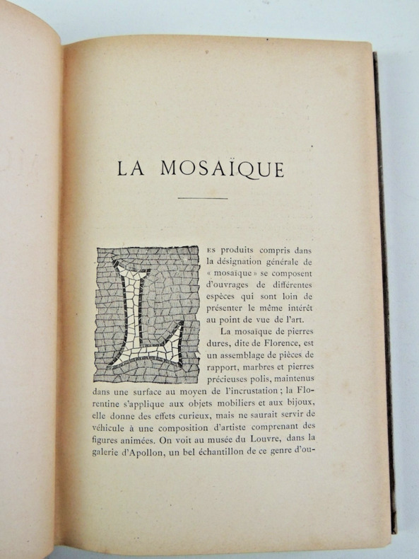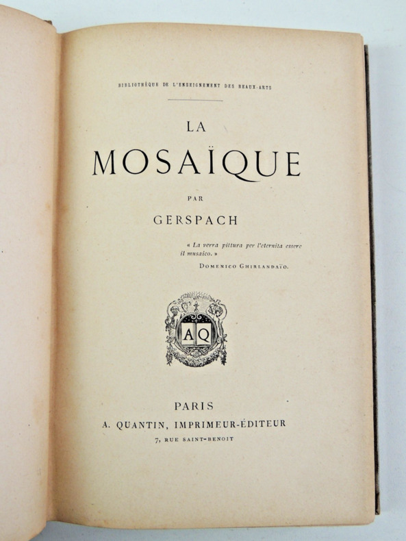 Répertoire géographique et nomenclature des artistes et des mosaïstes. Nouvelle édition. Collection "Bibliothèque de l'enseignement des Beaux-Arts". Cette collection a été dirigée par Jules Comte (1846-1912), qui a été un des promoteurs de l'enseignement des Beaux-Arts au début de la Troisième République. Elle compte une soixantaine de volumes de vulgarisation, mais chacun confié à un spécialiste et agrémenté de nombreuses illustrations illustré de nombreuses gravures noir et blanc dans le texte. vol relié, 210x140, couverture éditeur, bel état intérieur, 241pp Paris, Quantin, ss date 1881 ( Collection Bibliothèque de l'Enseignement des Beaux-Arts.) ref/170