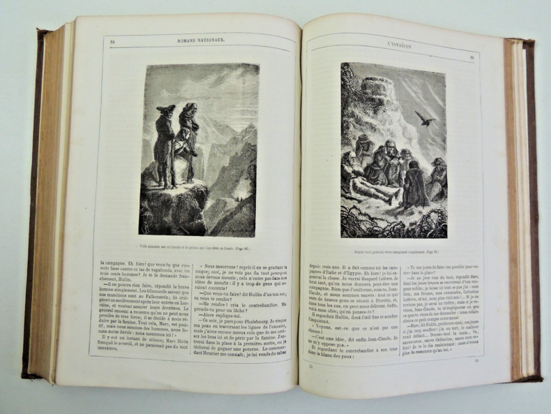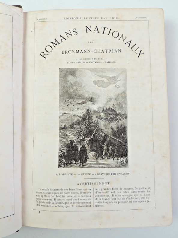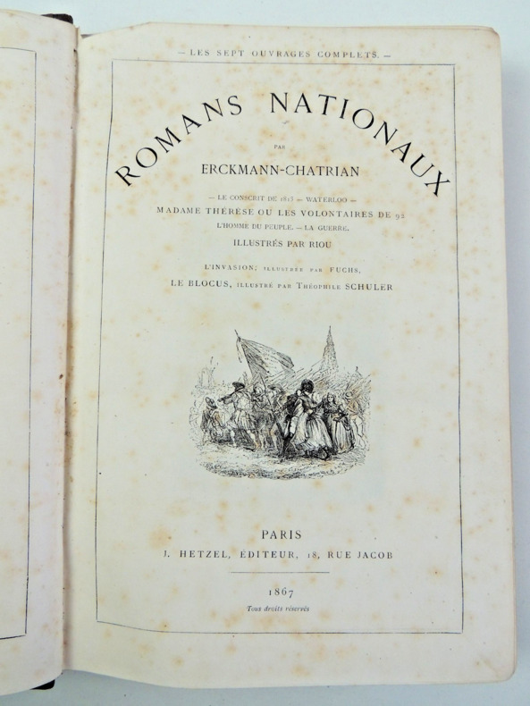 contient :Le conscrit de 1813 - Waterloo - Madame Thérèse ou les volontaires de 92 - L'homme du peuple - La Guerre, illustré par Riou - l'Invasion, illustrée par Fuchs - Le blocus, illustré par Théophile Schuler. Très nombreuses illustrations in texte. fort volume in-4, 290x200, relié demi cuir, décolorations en bordures de plats, rousseurs éparses, bon état intérieur, toutes tranches dorées, environ 500 pages. Paris, Hetzel, 1867