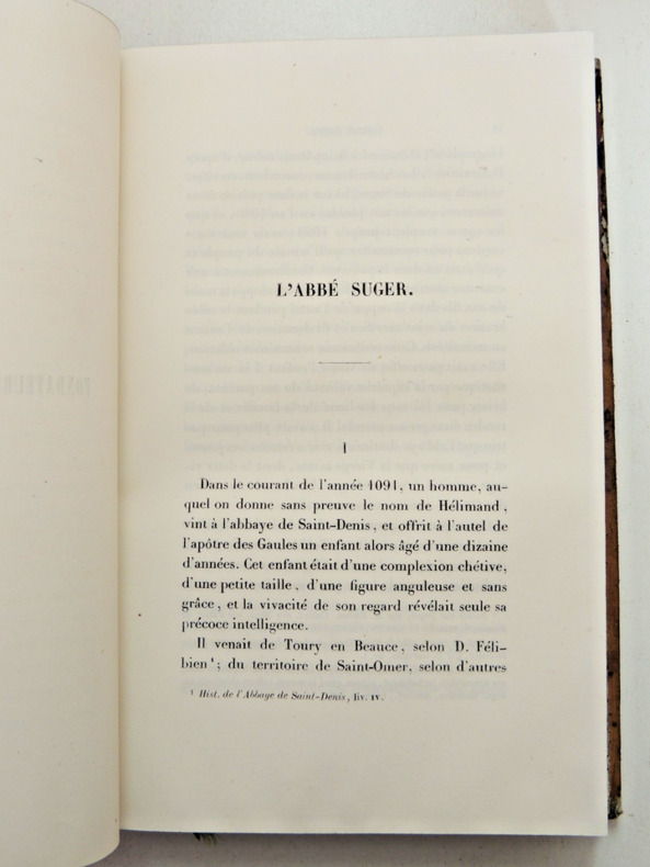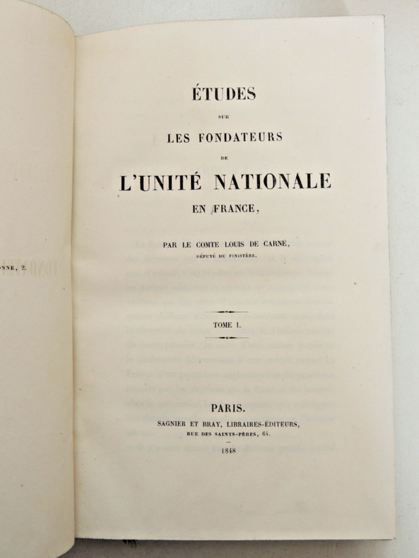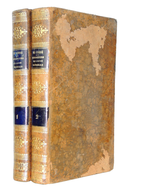 Les études consacrées aux fondateurs de l’unité nationale en France retracent la construction progressive d’un État centralisé, depuis les rois capétiens jusqu’à la République. Elles mettent en lumière des figures majeures comme Hugues Capet, Louis XIV ou encore Napoléon Bonaparte. Ces travaux soulignent le rôle de la langue, du droit et de l’administration dans l’unification du territoire. Ils insistent aussi sur les conflits et résistances ayant jalonné ce processus. La Révolution française apparaît comme un moment clé de refondation nationale. Enfin, ils interrogent la notion même d’unité, entre diversité régionale et projet politique commun. Suger - Saint Louis - Duguesclin - Jeanne D'Arc - Louis XI - Henri IV - Richelieu - Mazarin. Études Historiques. Aperçu sur l'histoire de l’Église en France, aperçu sur l'histoire des Lettres en France. Complet en 2 volumes reliés pleine basane époque, accrocs & manques, tranches jaspées, bon état intérieur, papier bien blanc, 443 & 400pp. Paris, Sagnier & Bray, 1848 ref/13bis