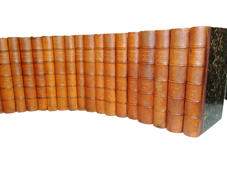 Edition originale complète en 20 volumes in 8 demi basane marron, 22x14cm, dos à 5 nerfs Tome 1 (1845 chez Paulin, Paris), faux titre, frontispice, un portrait de Thiers , page de titre, 494 p, 5 gravures pleine page. Tome 2 (1845 chez Paulin, Paris), faux titre, page de titre, 458 p, 5 gravures pleine page, Tome 3 (1845 chez Paulin, Paris), faux titre, page de titre, 570 p, 4 gravures pleine page, Tome 4 (1845 chez Paulin, Paris), faux titre, page de titre, 620 p, 4 gravures pleine page, tome 5 (1845 chez Paulin, Paris), faux titre, page de titre, 473 p, 5 gravures pleine page, Tome 6 (1847 chez Paulin, Paris), faux titre, page de titre, 573 p,6 gravures pleine page, Tome 7 (1847 chez Paulin, Paris), faux titre, page de titre, 684 p,5 gravures pleine page, Tome 8 (1849 chez Paulin, Paris), faux titre, page de titre, 687 pages, 4 gravures pleine page, Tome 9 (1849 chez Paulin, Paris), faux titre, page de titre, 596 pages, 5 gravures pleine page, Tome 10 (1851 chez Paulin, Paris), faux titre, page de titre, 511 pages, 4gravures pleine page, Tome 11 (1851 chez Paulin, Paris), faux titre, page de titre, 476 pages, 3 gravures pleine page, Tome 12 (1855 chez Paulin, Paris), faux titre, page de titre, 709 pages, 3gravures pleine page, Tome 13 (1856 chez Paulin, Paris), faux titre, frontispice, représentant le Roi de Rome Bébé, page de titre, 583 pages, 1 gravure à pleine page, Tome 14 (1856 chez Paulin, Paris), faux titre, page de titre, 686 pages, 5gravures pleine page, Tome 15 (1857 chez Paulin, Paris), faux titre, page de titre, 614 pages, 3 gravures pleine page, Tome 16 (1857 chez Paulin, Paris), faux titre, page de titre, 693 pages, 3 gravures pleine page, Tome 17 (1860 chez Paulin Lheureux, Paris), faux titre, page de titre, 945 pages, 3 gravures pleine page, Tome 18 (1860 chez Paulin Lheureux, Paris), faux titre, page de titre, 656 pages, 2 gravures pleine page, Tome 19 (1861 chez Lheureux, Paris), faux titre, page de titre, 637 pages, 2 gravures pleine page, Tome 20 (1862 chez Lheureux, Paris), faux titre, page de titre,814 pages, 2 gravures pleine page. Paris, Paulin 1845/ Lheureux 1862 Poids de l'ensemble 30 kg, envois en 2/3 colis. Envoi possible en Mondial Relais pour la France et les pays desservis.
