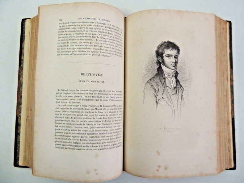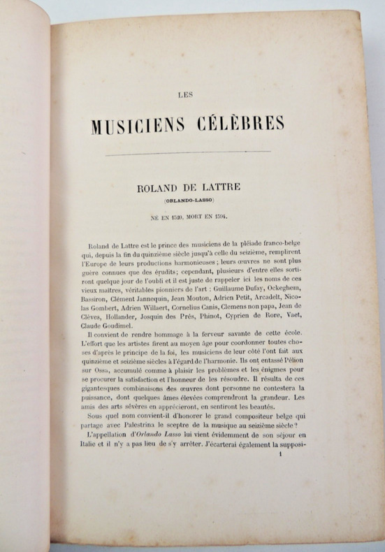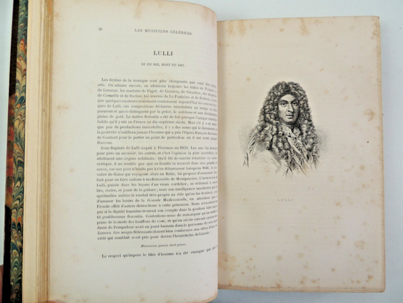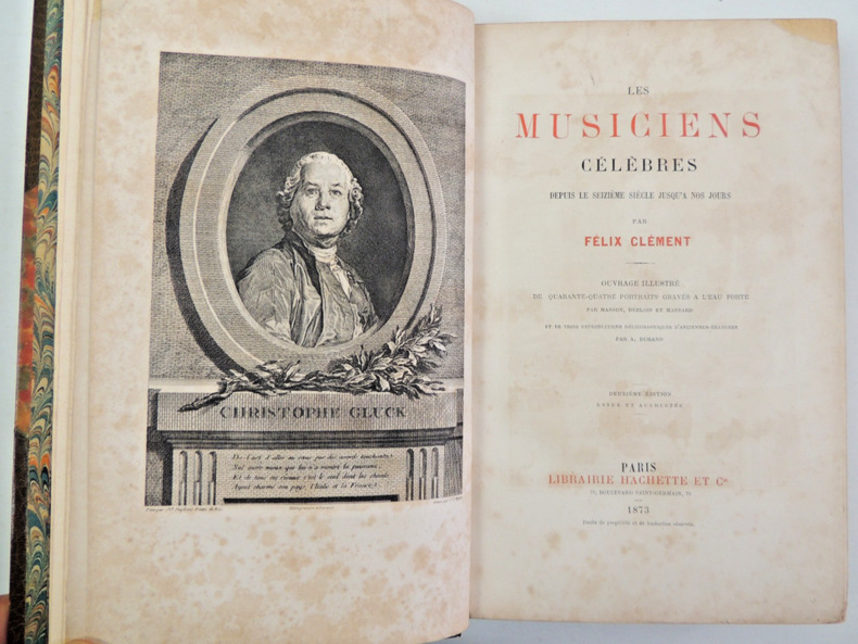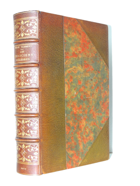 Excellente étude historique illustrée de beaux portraits. Première édition en 1868, 4e édition en 1887. Félix Clément (1822-1885), professeur de musique ancienne, était membre de la commission des arts et des édifices religieux. Il fit restaurer les orgues de la chapelle de la Sorbonne et rédigea le rapport sur les orgues. Ses travaux d’érudition firent l’objet de critiques louangeuses et son volume “Les Musiciens célèbres” fut plébiscité par les critiques : "Dans cet ouvrage, l’auteur donne l’histoire des musiciens célèbres depuis le XVIe siècle jusqu’à nos jours. Il a divisé son travail en quatre parties. Dans la première, il fait figurer la musique scolastique, depuis Palestrina jusqu’à Sébastien Bach ; dans la seconde, Haydn, Mozart, Beethoven, tous les maîtres de la composition idéale, y compris Méhul et Cherubini ; dans la troisième, Rossini et tous les musiciens de son école : nous assistons à l’épanouissement des formes mélodiques ; la liberté dans l’emploi des genres donne de la variété à l’inspiration et des richesses à l’orchestration plus développée. Enfin, dans la quatrième sont les romantiques, Weber, Meyerbeer, leurs adhérents et leurs suivants, recherchant avant tout le pittoresque, la couleur locale et les fortes impressions, lesquelles viennent enrichir l’art de nouveaux effets. Ce classement est celui qui se prête le plus logiquement à l’intelligence des révolutions de l'art musical. Pendant trois siècles, on en suit facilement les vicissitudes, les mouvements, les transformations. (...) Ce beau volume est le “De viris illuslribus” de la musique et il a toutes sortes de titres à devenir classique comme l’autre." (Larousse, Grand dictionnaire universel du XIXe siècle, tome 11) ; les biographies sont “intéressantes et bien faites” (Le Correspondant, 16 avril 1868), “pleines de renseignements précieux et le travail de l’auteur est consciencieux” (Le Ménestrel, 28 décembre 1867) ; “L’édition soignée et illustrée en fait un ouvrage réussi et recommandable” (Le Ménestrel, 8 mars 1868).