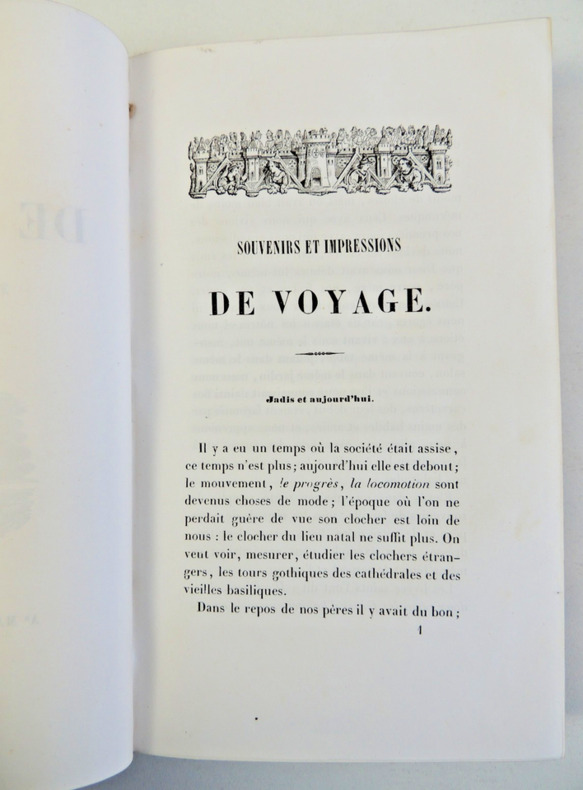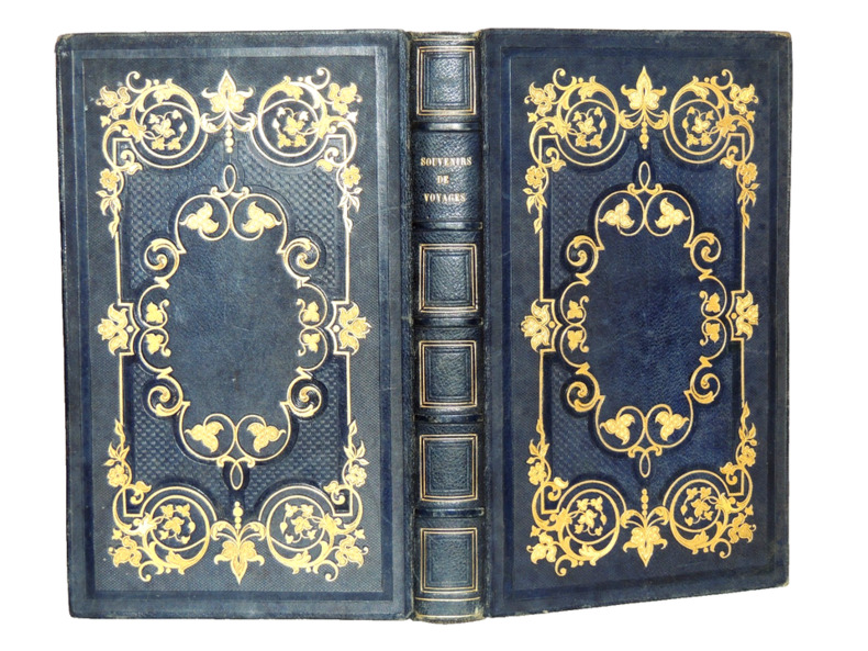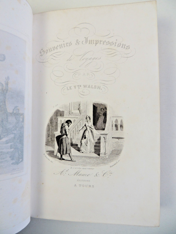 Souvenirs et impressions de voyage (mention de troisième édition) In 12 ( 215x135mm) pleine toile mauve de l’éditeur, plaque dorée sur le premier plat, filet et écoinçons à froid encadrant les plats, plaque dorée au dernier plat, fers en long et titre dorés, au dos. Frontispice gravé, titre gravé sous serpente, titre, 380 pages, tranches dorée. 3 gravures sur acier hors texte, sous serpente, y compris le frontispice. Tours A. MAME & Cie 1851. Rousseurs, principalement en début et fin de volume ; reliure insolée.