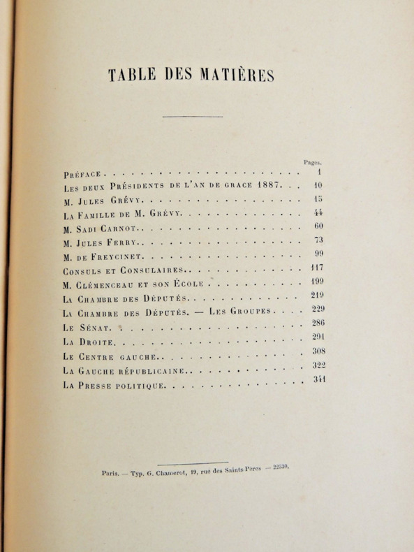 Table : les deux Présidents de 1887 - Jules Grévy - Sadi Carnot - Jules Ferry - M. de Freycinet - Consuls & Consulaires - Clémenceau et son école - la chambre des députés - le sénat- le centre gauche - la gauche républicaine - la presse politique. Complet deux tomes en un volume in4, 260x175, relié demi cuir, jolie reliure, parfait état intérieur, 397 & 397pp. Très bel exemplaire ! Paris, Nouvelle revue, 1887