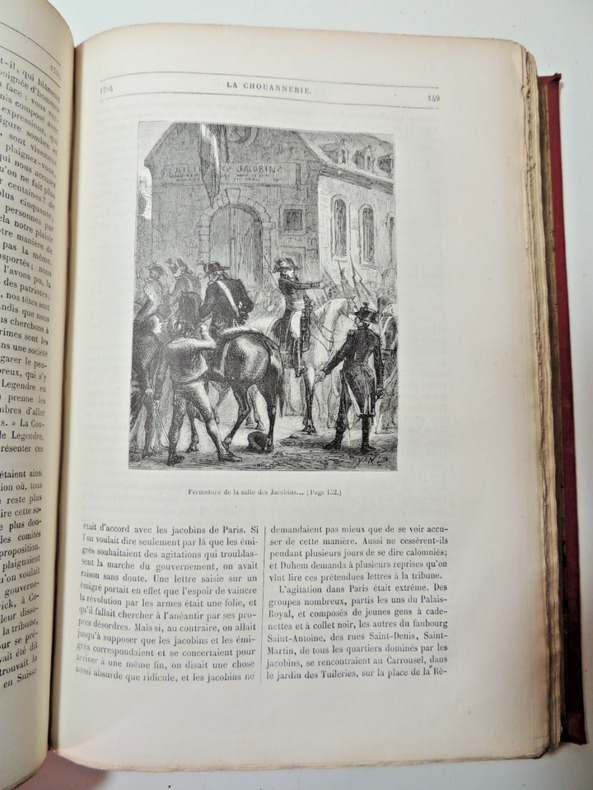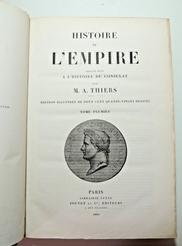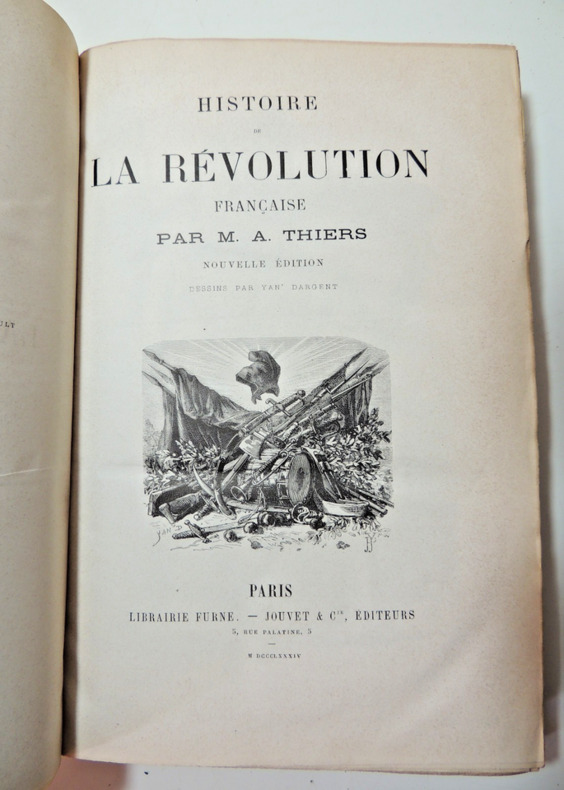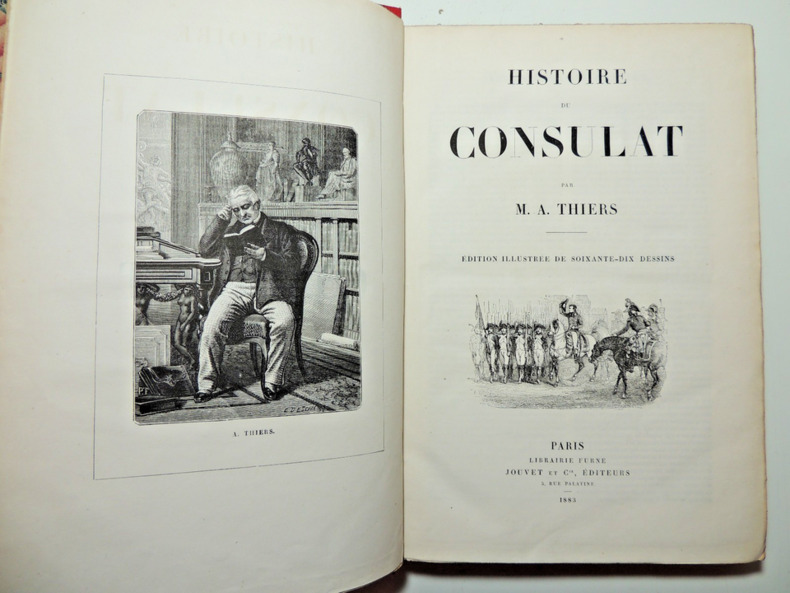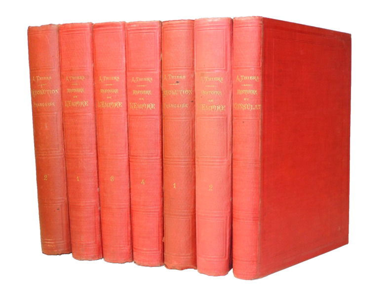 HISTOIRE DE LA RÉVOLUTION FRANÇAISE, Nouvelle édition, complet en 2 vols, dessins par Yan d'Argent, Paris Furnes & Jouvet 1883 HISTOIRE DU CONSULAT, édition illustrée de 70 dessins, complet un vol, Paris Furnes & Jouvet, 1883 HISTOIRE DE L'EMPIRE faisant suite à l'Histoire du Consulat, complet en 4 volumes, Furnes & Jouvet, nombreuses illustrations, Paris 1879 Thiers .A complet en 7 vols, gd in8, 300x205, reliés toilés. Bon état intérieur, bien frais, bons exemplaires.