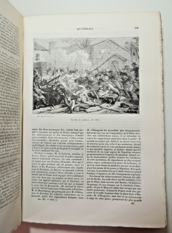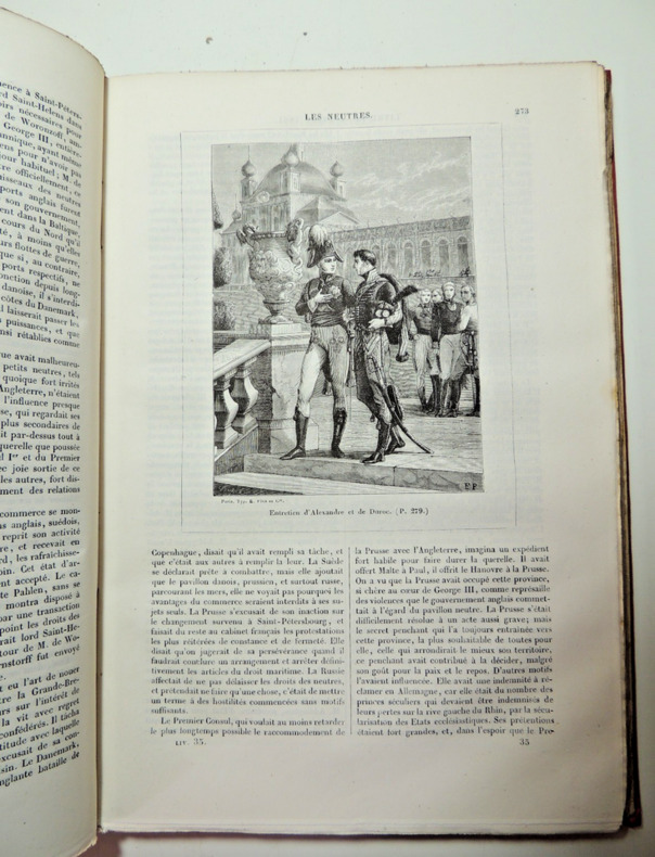 Tome 1. 494 pages. Constitution de l'An VIII, Administration intérieure, Ulm et Gènes, Marengo. Tome 2. 456 pages. Héliopolis, Armistice, Hohenlinden, Machine infernale, Les neutres. Tome 3. 570 pages. Evacuation de l'Egypte, Paix générale, Concordat, Tribunat, Consulat à vie. Tome 4. 620 pages. Les sécularisations, Rupture paix d'Amiens, Camp de Boulogne, Conspiration de Georges. Tome 5. 473 pages. L'Empire, Le sacre, troisième coalition. Tome 6. 573 pages. Ulm et Trafalgar, Austerlitz, Confédération du Rhin. Tome 7. 684 pages. Iéna, Eylau, Friedland et Tilsit. Tome 8. 687 pages. Fontainebleau, Aranjuez, Bayonne. Tome 9. 596 pages. Baylen, Erfurt, Somo-Sierra. Tome 10. 511 pages. Ratisbonne, Wagram. Tome 11. 476 pages. Talavera et Walcheren, le divorce. Tome 12. 709 pages. Avertissement de l'auteur, Blocus continental, Torrès-Védras, Fuentès d'Onoro. Tome 13. 583 pages. Le Concile, Tarragone, Passage du Niémen. Tome 14. 686 pages. Moscou, La Bérézina. Tome 15. 614 pages. Washington et Salamanque, Les cohortes, Lutzen et Bautzen. Tome 16. 693 pages. Dresde et Vittoria, Leipzig et Hanau. Tome 17. 911 pages. L'invasion, Brienne et Montmirail, Première abdication, Conclusion. Tome 18. 656 pages. Restauration des Bourbons, Gouvernement de Louis XVIII, Congrès de Vienne. Tome 19. 637 pages. L'Ile D'Elbe, L'Acte additionnel, Le Champ de Mai. Tome 20. 810 pages. Waterloo, Seconde abdication, Sainte-Hélène. Atlas de la Révolution, du Consulat et de l'Empire. Image disp.