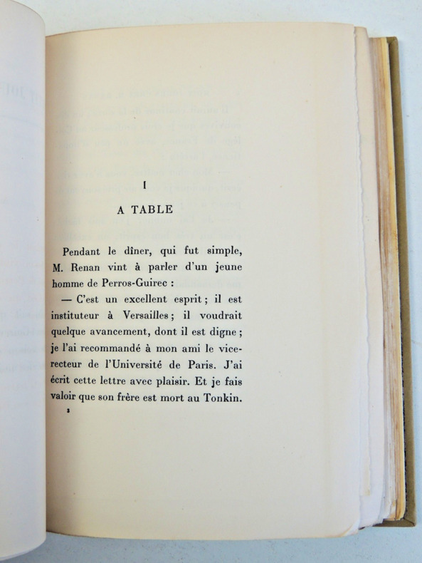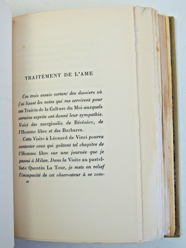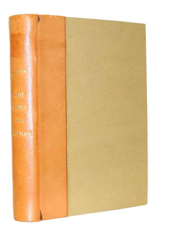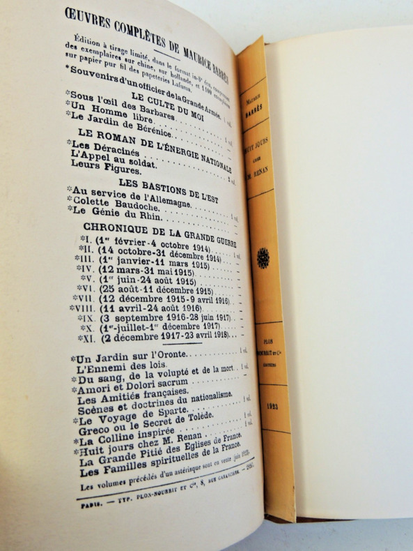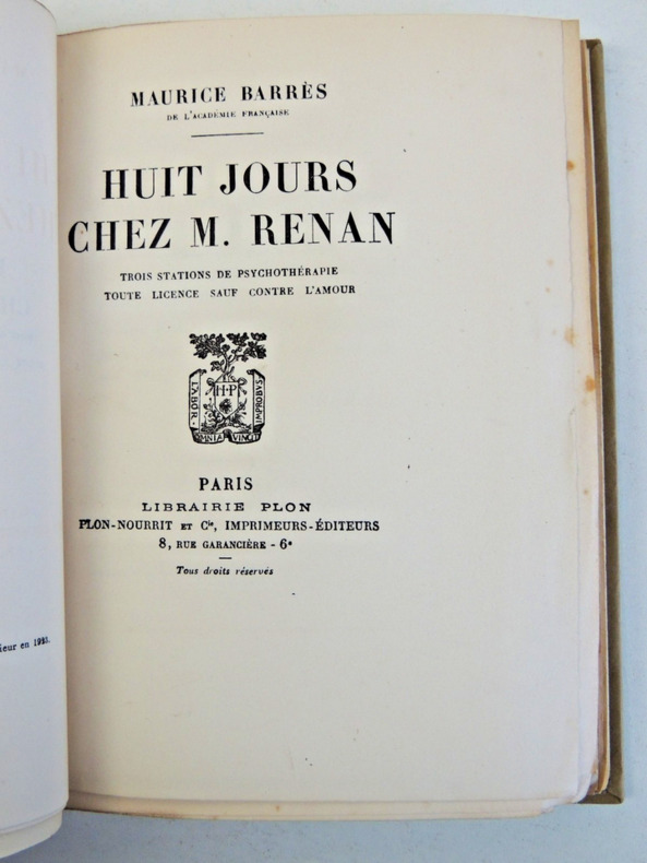 Trois textes de Maurice Barrès, écrivain majeur de la fin du XIXᵉ siècle, souvent associé au nationalisme et à une littérature introspective. Ces textes montrent un Barrès jeune, introspectif et influencé par la psychologie. Ils annoncent son évolution vers une pensée plus enracinée et politique. La figure de Ernest Renan joue un rôle clé comme contre-modèle intellectuel. Huit jours chez Monsieur Renan. Texte de jeunesse (publié vers 1888). Barrès y évoque sa rencontre avec Ernest Renan. C’est à la fois un portrait intellectuel et une réflexion sur le scepticisme, la foi et la modernité. On y voit déjà l’opposition entre raison critique (Renan) et besoin d’enracinement et de sentiment (Barrès). Trois stations de psychothérapie. Texte introspectif, typique de la période du Culte du moi. Barrès y explore les moyens de se reconstruire intérieurement. Il décrit différentes « étapes » ou expériences psychologiques visant à retrouver une unité personnelle. Influence du climat fin-de-siècle, marqué par la psychologie, la décadence et la quête de soi. Toute licence sauf contre l’amour. Texte bref et aphoristique. Barrès y défend une idée paradoxale : la liberté doit être totale… sauf lorsqu’elle menace l’amour. L’amour est présenté comme une valeur fondamentale et structurante, supérieure aux autres libertés. vol relié demi cuir, très bel exemplaire sur grand papier, couvertures conservées, 262pp exemplaire sur pur fil lafuma 484/1150, petit tirage Paris Plon, achevé d'imprimé 13 juin 1922 ref/170