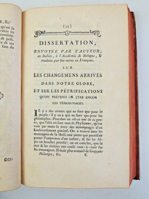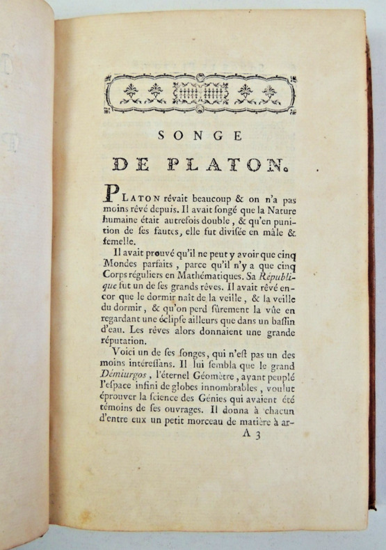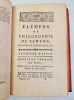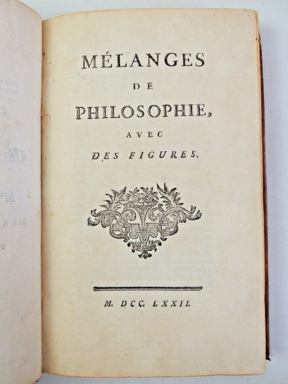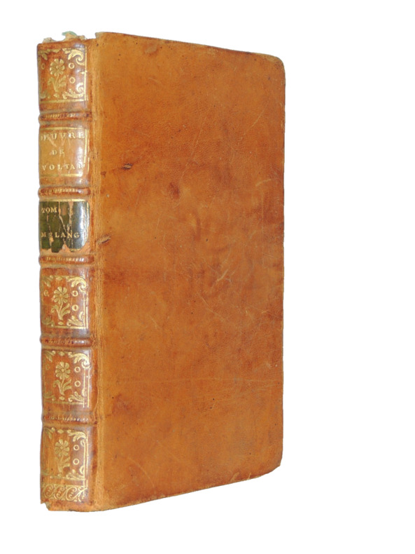 Ce troisième tome des "Mélanges de philosophie" fait partie de la première édition des œuvres complètes de Voltaire, publiées en 1756. Il comprend divers chapitres dont: "Songe de Platon"," Lettre à Mr. De Gravesande", "Épitres à Madame la Marquise du Châtelet", "Lettre à Mr. Martin Kahle", "Lettre sur Roger Bacon", différentes dissertations, "Micromégas", "Éléments de philosophie de Newton" et "Remarques sur la pensée de Mr. Pascal". volume grand in8, pleine basane époque, bon état, coiffe arasée, 20x13cm, frais, 416pp. Exemplaire complet en lui-même. ref/23/5