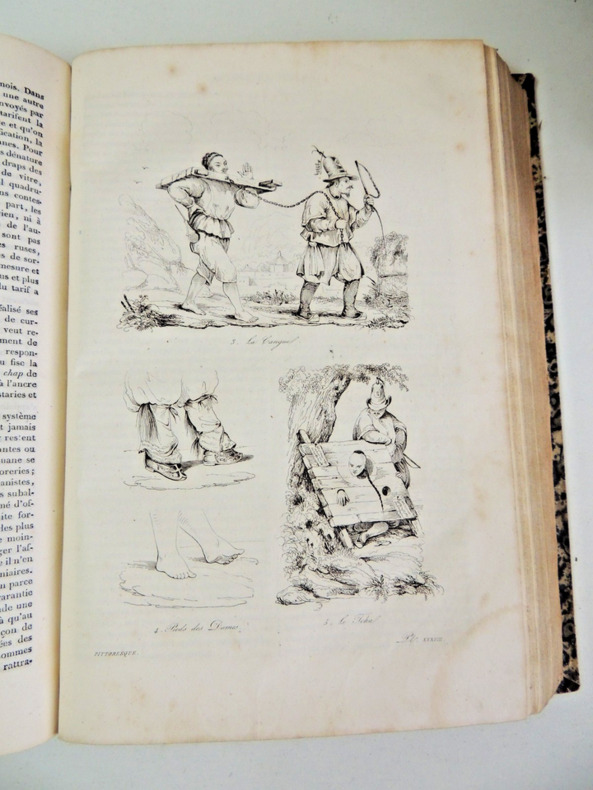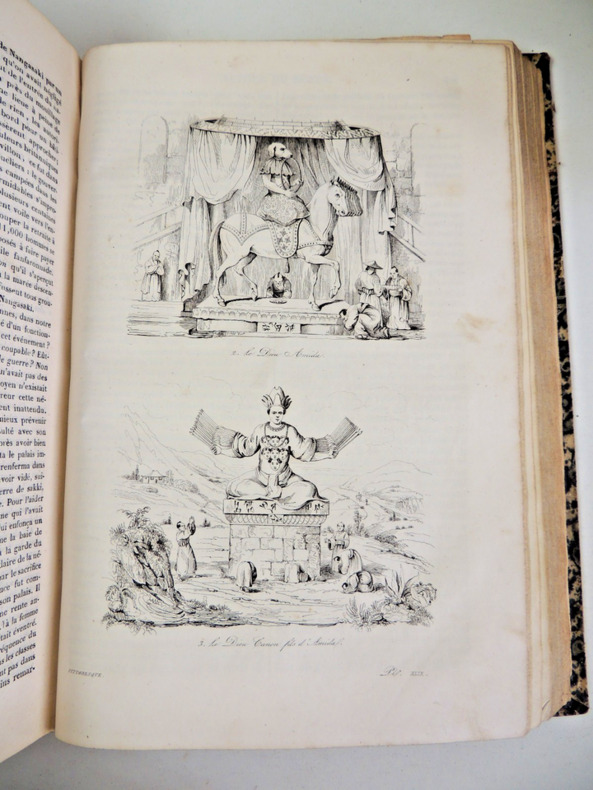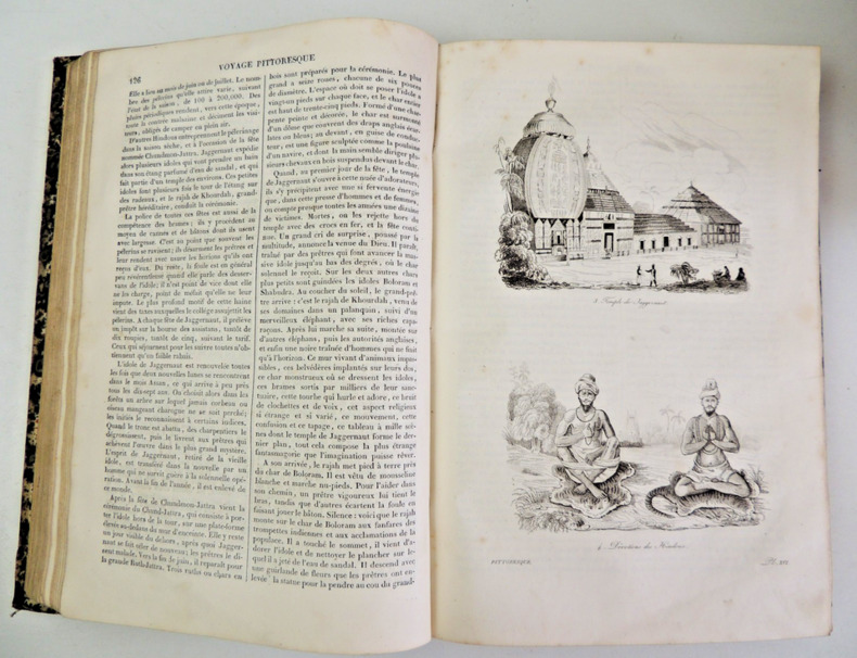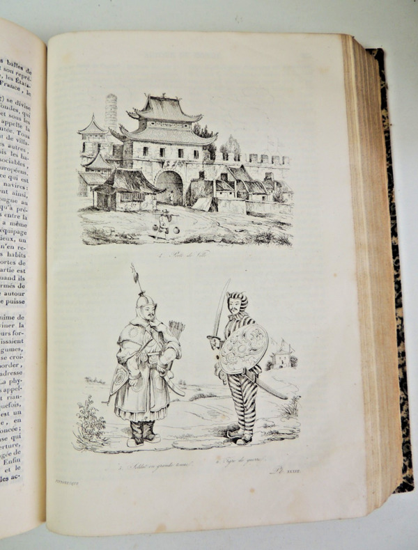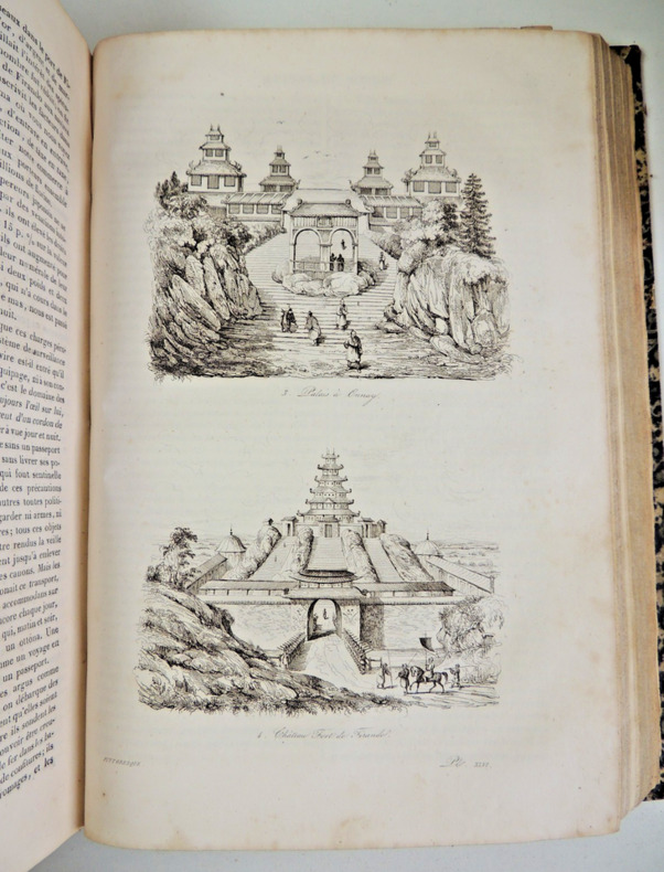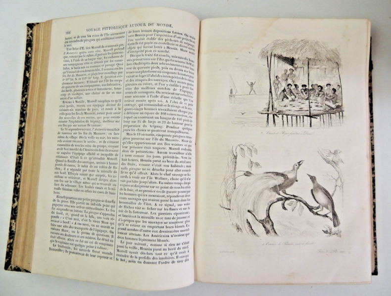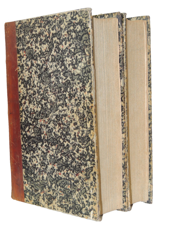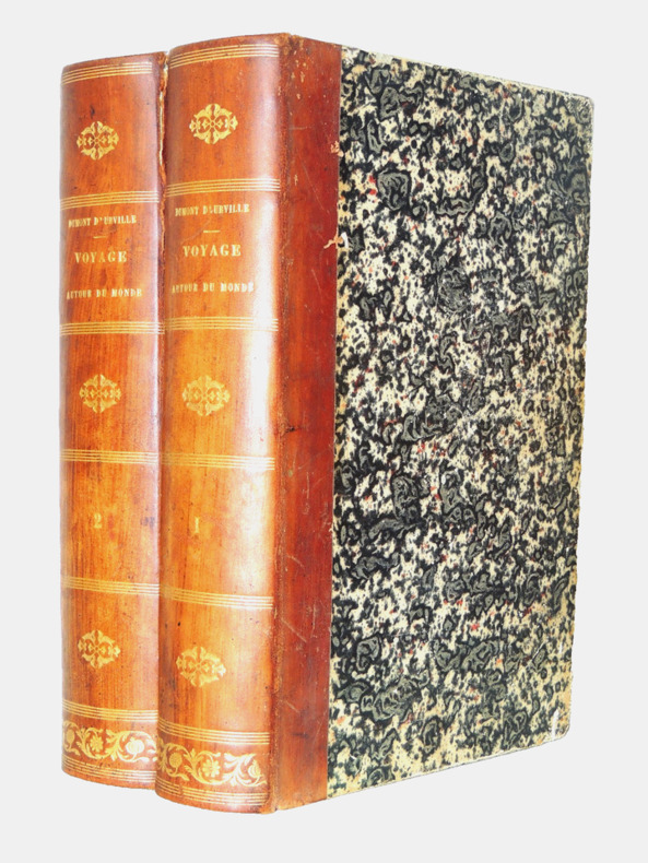 Les "Voyages pittoresques autour du Monde" sont une série d'ouvrages de voyage publiés au 19e siècle. L'un des auteurs les plus célèbres de cette série est Jules Dumont d'Urville, un explorateur français. Jules Dumont d'Urville a commandé plusieurs expéditions d'exploration en mer au cours de sa carrière, dont certaines ont été documentées dans les "Voyages pittoresques autour du Monde". L'une de ses expéditions les plus connues est celle menée à bord du navire La Astrolabe, qui a exploré les régions polaires et l'océan Pacifique entre 1826 et 1829. Les récits de voyage de Dumont d'Urville étaient populaires à l'époque car ils offraient aux lecteurs un aperçu détaillé des terres inconnues, des cultures étrangères et de la faune et la flore exotiques. Les ouvrages étaient souvent richement illustrés de gravures et de cartes, ce qui ajoutait à leur attrait visuel. Les "Voyages pittoresques autour du Monde" de Dumont d'Urville ont contribué à élargir les connaissances géographiques et scientifiques de l'époque, ainsi qu'à susciter l'intérêt du public pour les découvertes et les explorations. Ces récits de voyage continuent d'être étudiés et appréciés aujourd'hui, tant pour leur valeur historique que pour leur description des régions et des cultures lointaines. Résumé général des voyages de découvertes de Magellan, Tasman, Dampier, Anson, Byron, Wallis, Carteret, Bougainville, Cook, Lapérouse, G.Bligh, Vancouver, d' Entrecasteaux, Wilson, Baudin, Flinders, Krusenstern, Porter, Kotzebue, Freycinet, Bellinghausen, Basil Hall, Duperrey, Paulding, Beechey, Dumont d'Urville, Lutke, Dillon, Laplace, D. Morbell, etc. Les gravures en taille-douce sur acier, d'après les dessins de M. de Sainson, dessinateur du Voyage de l'Astrolabe. Portraits en frontispices en noir et blanc. Tome I : 2 ff., VIII-576 pp. avec frontispice et 140 planches hors texte et 3 cartes dépliantes ; Tome II : 2 ff., 584 pp. avec frontispice double et 136 planches hors texte et 3 cartes dépliantes exemplaires bien complets des 276 planches hors texte, de 2 frontispices (dont le double) et des 6 cartes dépliantes, texte dur deux colonnes. complet en deux vols in-quarto, 285x190, reliés demi basane époque, mors fendus en partie, accrocs, reliures à restaurer, les corps des ouvrages étant bien reliés, qq rehaut de cahiers. Paris chez Lentré, 1834/1835. Edition originale