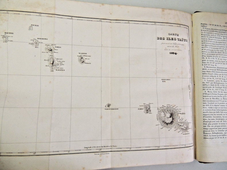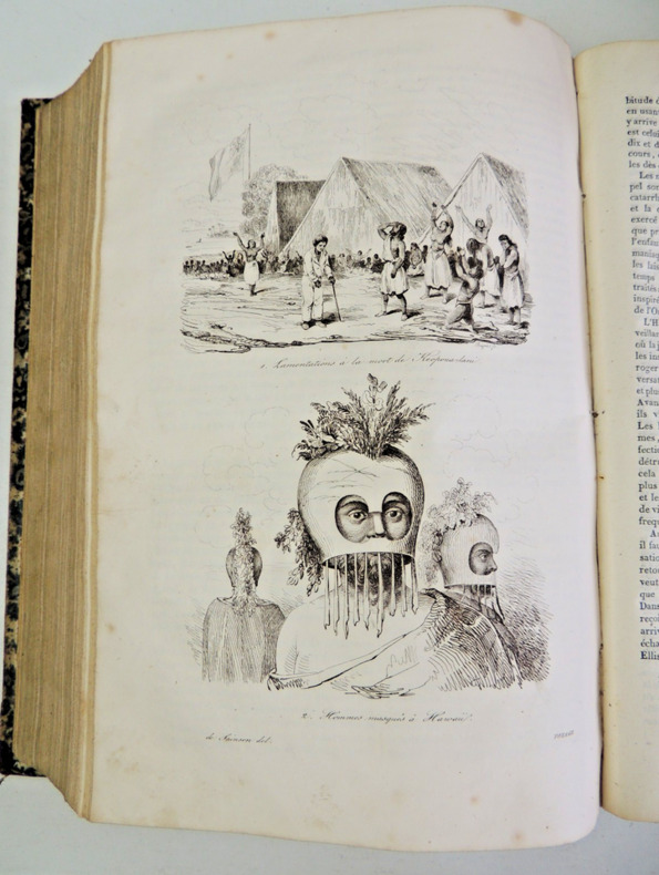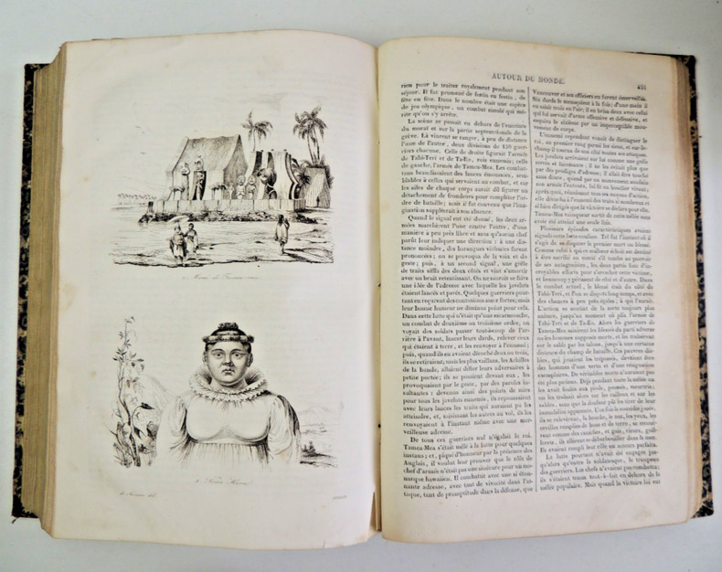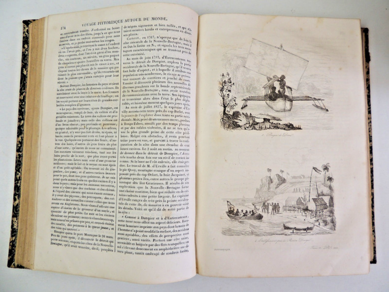 Résumé général des voyages de découvertes de Magellan, Tasman, Dampier, Anson, Byron, Wallis, Carteret, Bougainville, Cook, Lapérouse, G.Bligh, Vancouver, d' Entrecasteaux, Wilson, Baudin, Flinders, Krusenstern, Porter, Kotzebue, Freycinet, Bellinghausen, Basil Hall, Duperrey, Paulding, Beechey, Dumont d'Urville, Lutke, Dillon, Laplace, D. Morbell, etc. Les gravures en taille-douce sur acier, d'après les dessins de M. de Sainson, dessinateur du Voyage de l'Astrolabe. Portraits en frontispices en noir et blanc. Tome I : 2 ff., VIII-576 pp. avec frontispice et 140 planches hors texte et 3 cartes dépliantes ; Tome II : 2 ff., 584 pp. avec frontispice double et 136 planches hors texte et 3 cartes dépliantes exemplaires bien complets des 276 planches hors texte, et des 6 cartes dépliantes, texte sur deux colonnes. complet en deux vols in-quarto, 285x190, reliés demi cuir, frottements, bel état intérieur, petites taches d'usage. Paris chez Lentré, 1834/1835. Edition originale