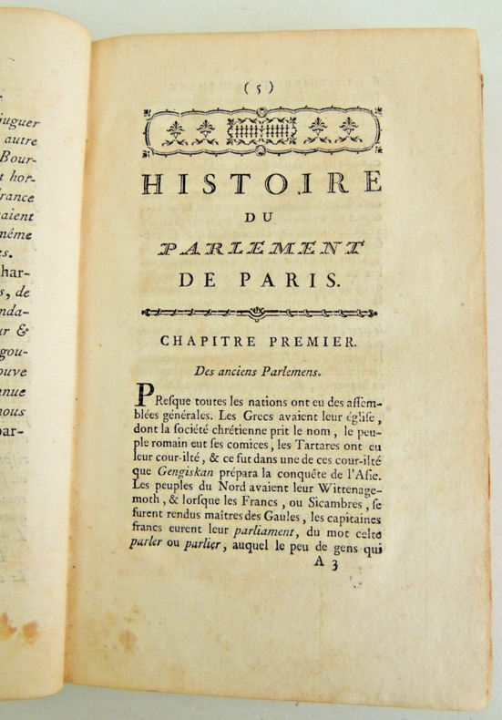 Exposé des divers systèmes sur l'origine du Parlement de Paris - Institutions Mérovingiennes - Institions Carolingiennes. Paris. Chez l'auteur. 1847. In-8 (21x13). XV-262 pages. Demi-basane marine de l'époque, dos lisse orné de triple-filets dorés.