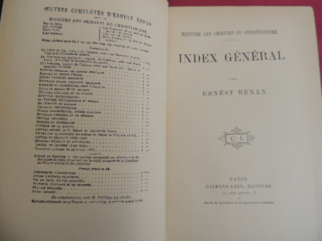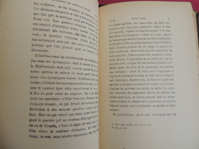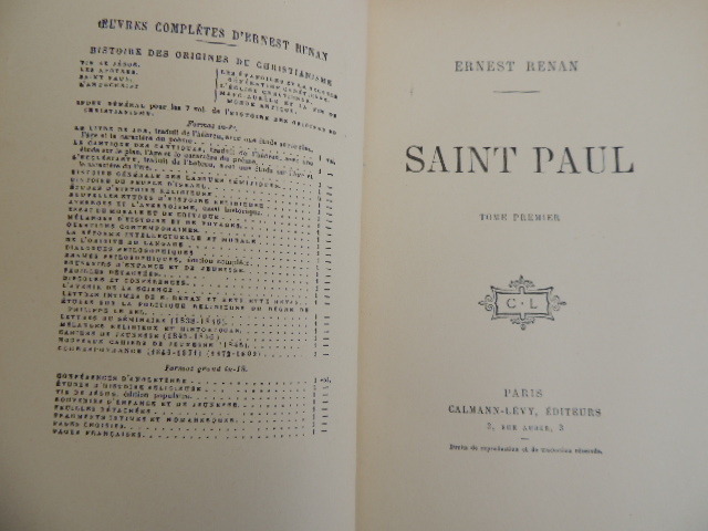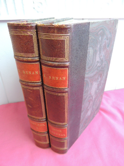 ERNEST RENAN 2 vols: Saint -Paul, Tome I, 226pp Index général, 298pp, une carte dépliante couleur " extension du Christianisme vers l'an 180 " en fin de vol forts vols. in-8, 240x150, reliés demi cuir, frottements, tranches de tête dorées, bien frais beaux exemplaires Calmann Lévy 1927/1928
