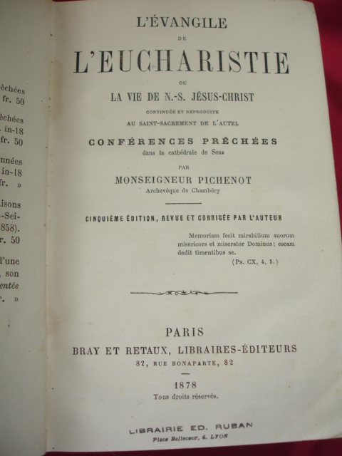 L’ÉVANGILE DE L'EUCHARISTIE ou LA VIE DE N.S JÉSUS CHRIST Monseigneur Pichenot suivi de : LA PRIÈRE DE L'EGLISE 2 volumes reliés en un tome vol relié, 180x120, relié demi cuir, frottements, 430 & 376pp, bel état intérieur Paris, Bray & Retaux 1878/1879