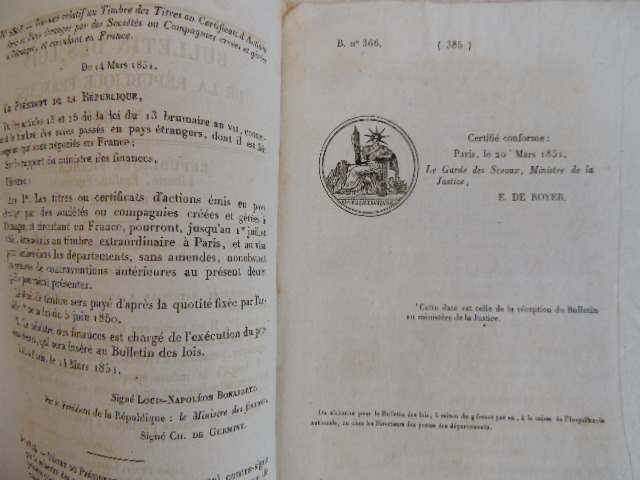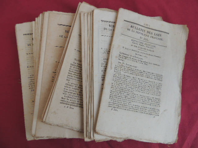 LOT DE 49 BULLETIN DES LOIS DE LA RÉPUBLIQUE FRANÇAISE années 1847 à 1851 divers : prix moyen de l'hectolitre ( 1847) - décret qui autorise à la Falaise l'établissement de filles de l'éducation Chrétienne (1851) - Loi sur la Garde Nationale ( 1851) - Loi sur les ventes publiques ( 1851) - Convention littéraire entre la France et le Portugal ( 1851) - loi sur les Caisses Epargnes ( 1851) - Arrété qui proclame les brevets d'inventions (1851), ...etc Imprimerie Nationale