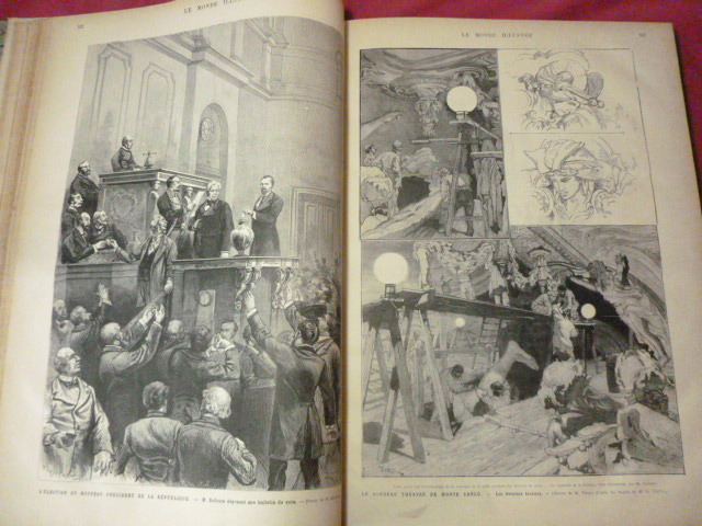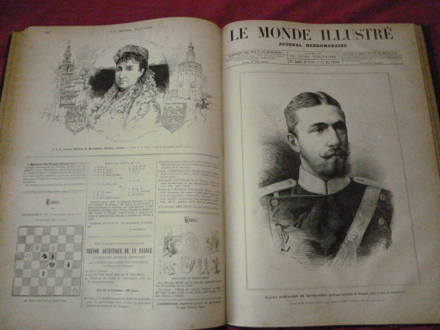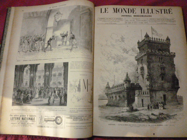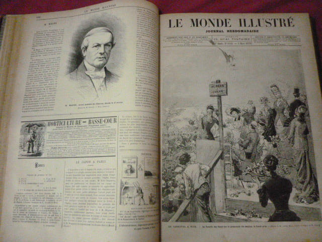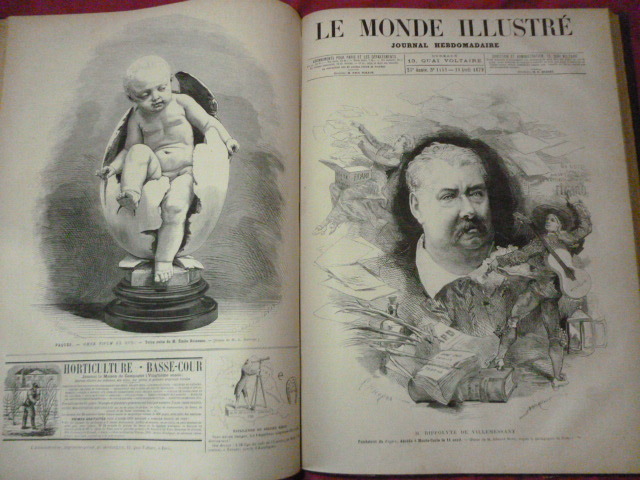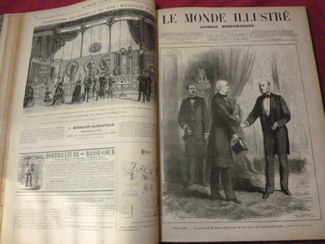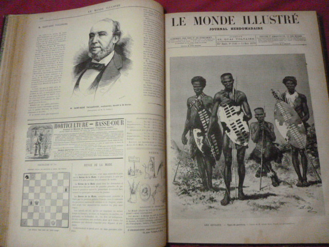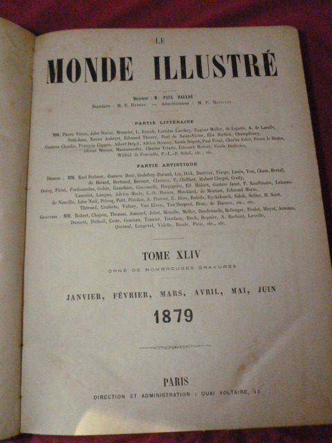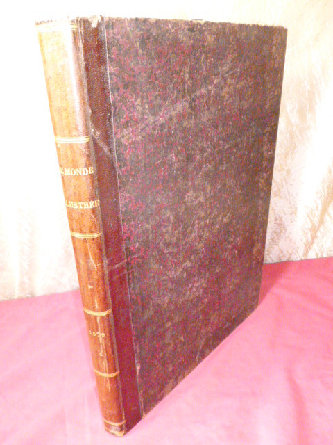 LE MONDE ILLUSTRE. Journal hebdomadaire. Tome XLIV: janvier à juin 1879. Dir Paul Dalloz In folio (27 x 37 cm), 420 p. Ouvrage relié demi cuir bleu. Dos lisse, orné de filets dorés, frottements, qq pages froissées, bon état. Titre doré au dos,complet pour la période. Nombreuses planches et gravures Paris, Direction et Administration, 1879.