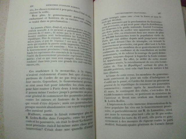 MEMOIRES POSTHUMES DE ODILON BARROT Tomes I, II & III ( sans le tome IV dernier) volumes in-8, 230x145, reliés demi cuir, dos à nerfs, frottements,bon état intérieur, 502, 482 & 612pp Paris Charpentier 1875 ref/c24