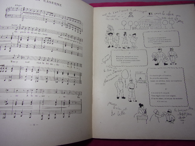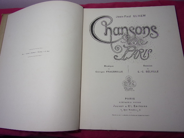 CHANSONS DE PARIS Jean-Paul Elhem musique de Georges Fragerolle, dessins de E.C Belville Table des matières : dédicace - Tout Paris - La ballade de l'ours - Une première - Les champs Elysées - A la caserne - La butte Montmartre - Jeune fille - Vieille fille - Les grands boulevards - La lettre et l'esprit vol, relié dos toile ( passée ) 300x230, très bon état intérieur, 84pp Paris Furnes, 1894 d'autres volumes en vente, groupez les achats !