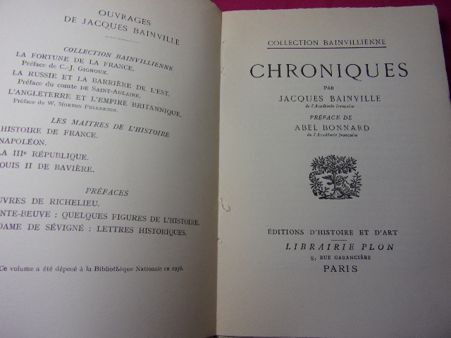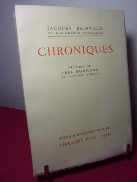 CHRONIQUES Jacques Bainville Préface de Abel Bonnard, collection Bainvilliennes vol broché, 180x140, très bon état, 287pp Edition d'Histoire & d'Art, Plon 1938 ref/78/3