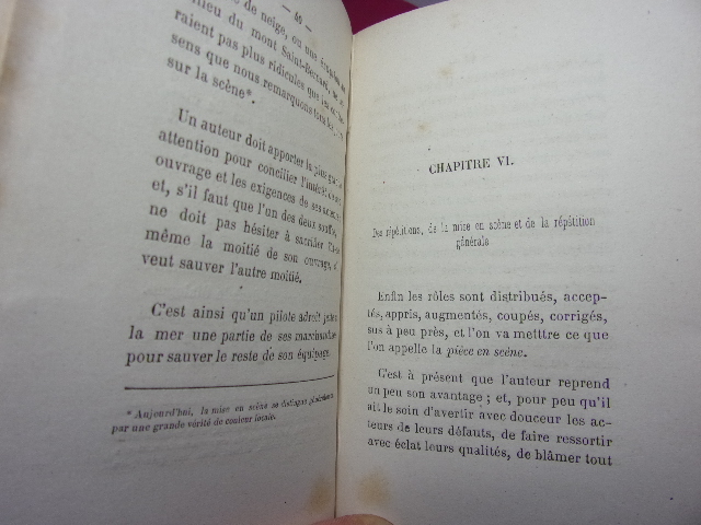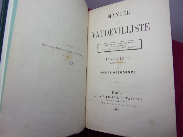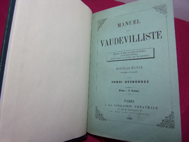 Relié à la bradel, pleine percaline verte, dos lisse orné d'une pièce de titre aux fers dorés. Les couvertures originales sont conservées.In-12 (9 x 14.5 cm). 126 pp. Complet.Nouvelle édition corrigée et annotée. BIOGRAPHIE & THEME:Des qualités indispensables pour se faire auteur - Du choix d'un sujet - Des collaborateurs - Des comités de lecture - De la distribution des rôles - Des répétitions, de la mise en scène et de la répétition générale... Paris: Librairie Théâtrale, 1861 ref/78/3