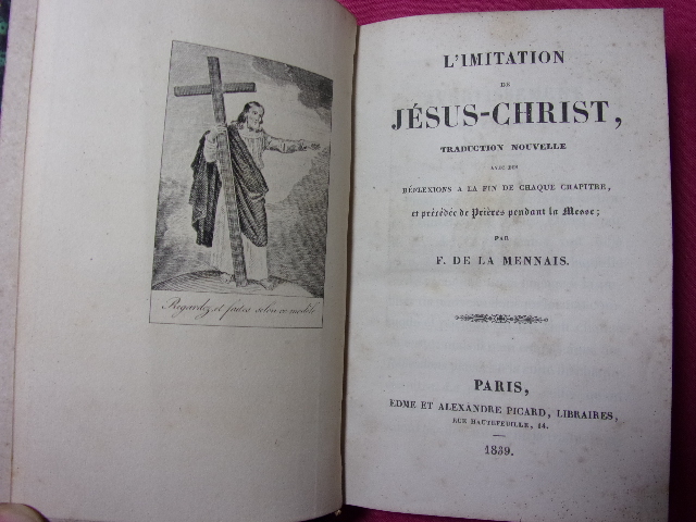 L'IMITATION DE JÉSUS-CHRIST traduction nouvelle avec des réflexions à la fin de chaque chapitre et précédée de prières pendant la messe F. de La Mennais vol relié demi cuir, in12, 170x130, frottements, bon état int. 549pp Paris. Edme & Picard 1839 ref/c85