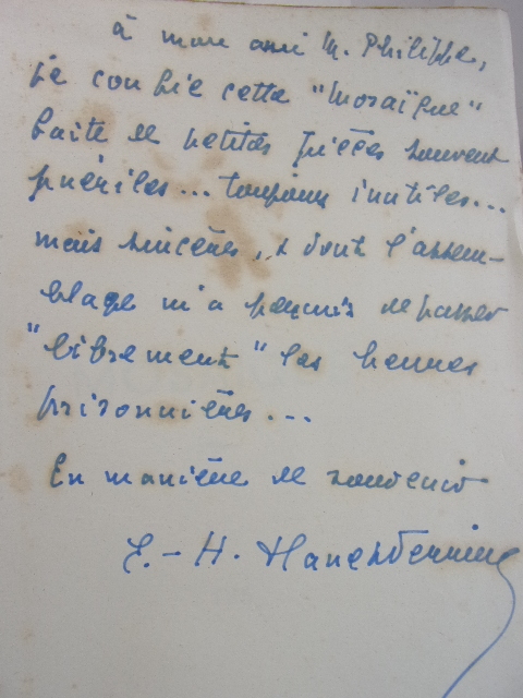 MOSAÏQUE E.H. Flanet-Ferrier Bel et long envoi autographe en page de garde, juin 1943 Préface de Jean Paul Léon broché, 200x140, qq rousseurs, bon état int. 328pp Imprimerie Provinciale de l'Ouest. 1941