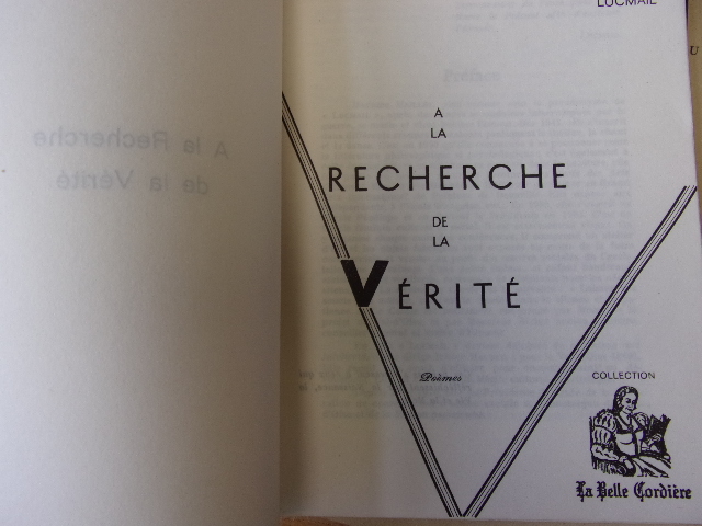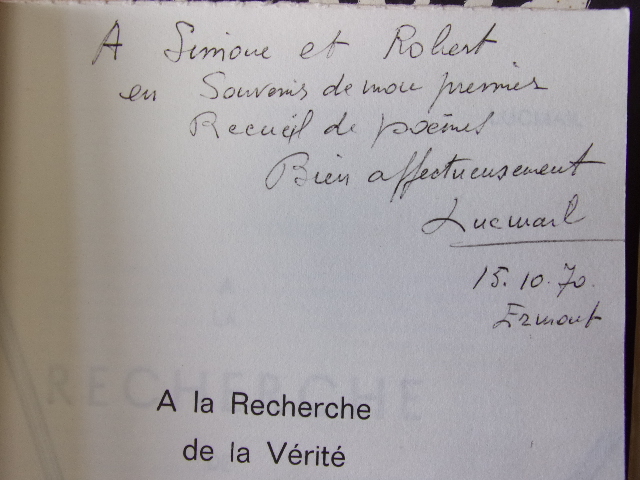 A LA RECHERCHE DE LA VÉRITÉ ( Poèmes ) Lucmail Bel envoi autographe en page de garde broché, 190x140, très bel état int., 54pp Edition La Belle Cordière 1970