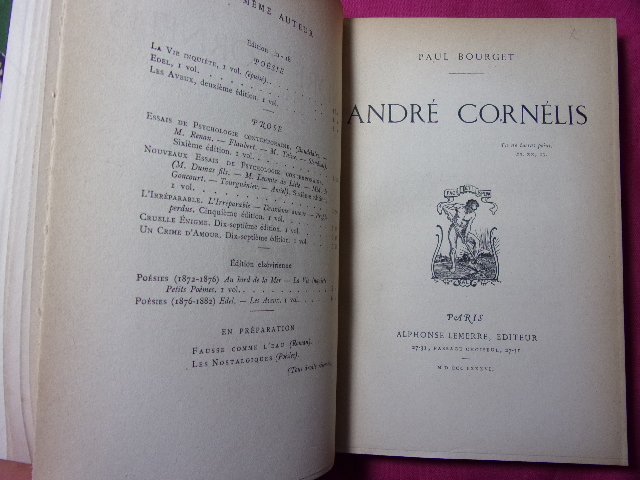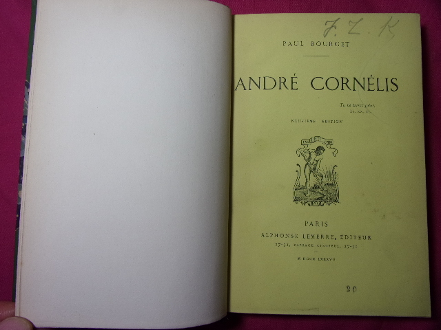 ANDRÉ CORNELIS Paul Bourget volume relié demi toile, tranche de tête dorée, couvertures d'origines conservées, frottements, 190x140, bon état intérieur, 350pp ex libris KunKelmann " bien faire, laissez dire " Paris, Alphonse Lemerre 1887 d'autres volumes du même auteur dans la même reliure, groupez les achats ! ref/c89