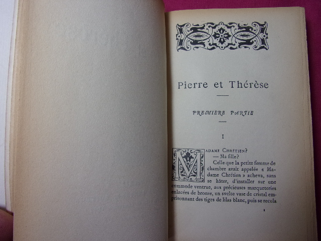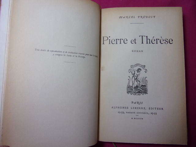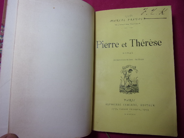 PIERRE ET THÉRÈSE Marcel Prévost volume relié demi toile, tranche de tête dorée, couvertures d'origines conservées, frottements, 180x130, bon état intérieur, 331pp ex libris KunKelmann " bien faire, laissez dire " Paris, Alphonse Lemerre, 1909 d'autres volumes du même auteur dans la même reliure, groupez les achats ! ref/c89