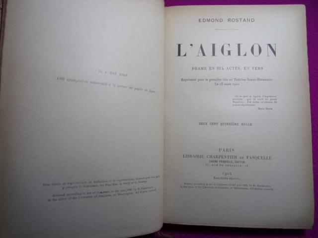 L'AIGLON Edmond Rostand drame en six actes, en vers, représenté pour la première fois au Théâtre Sarah Bernhard le 15 mars 1900. vol.in8, relié demi cuir, 200x150, bel exemplaire, 262pp. Paris. Charpentier & Fasquelle 1904