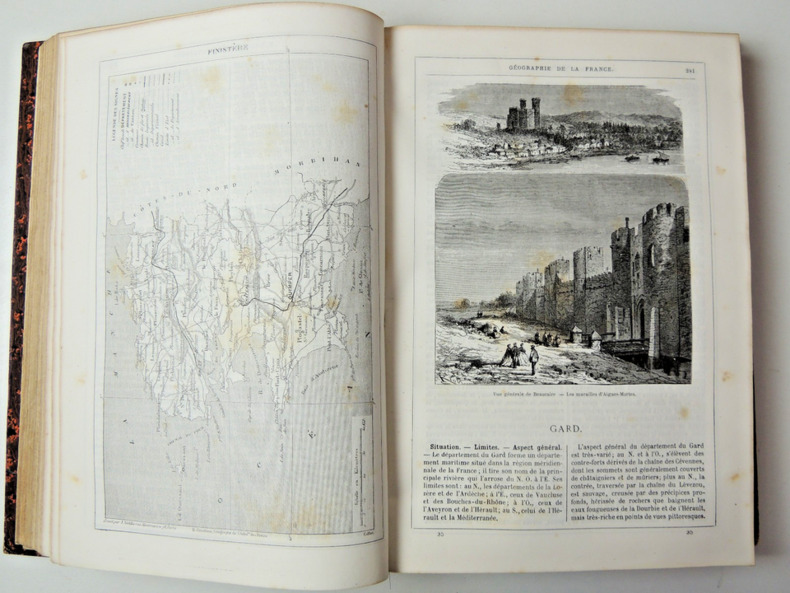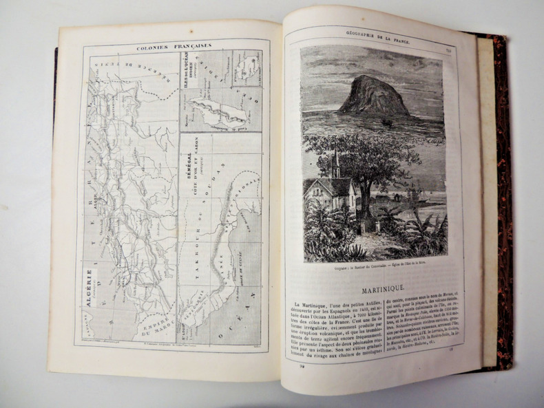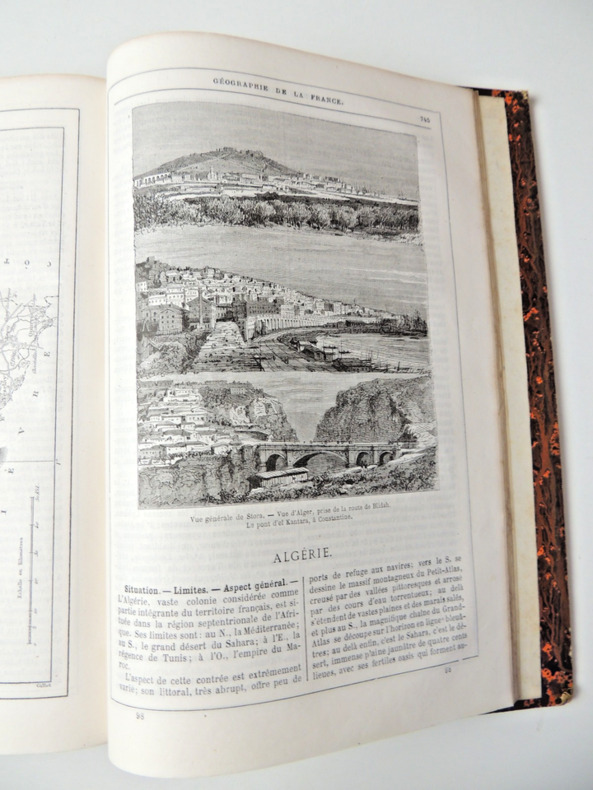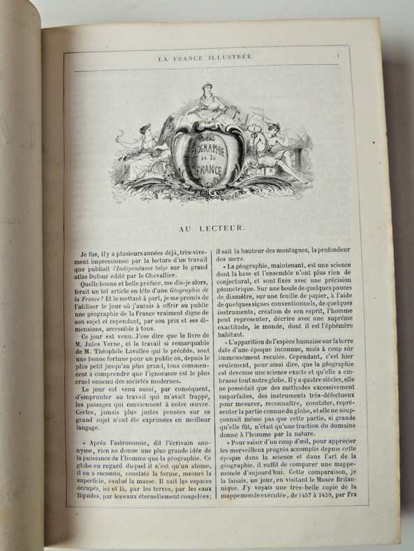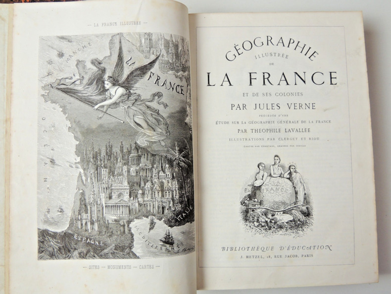 Géographie illustrée de la France et de ses colonies par Jules VERNE précédée d’une Etude sur la Géographie Générale de la France par Théolphile LAVALLEE – Illustrations par CLERGET et RIOU – Cartes par Constans, gravées par Sedilie » Bibliothèque d’éducation Hetzel, Paris, xxxii+768 pages. SD. L’éditeur dit que Jules Verne a puisé dans les recensements de 1866. Frontispice, toutes tranches dorées, reliure de l’éditeur, dos insolé, en queue est indiqué Libraire Pigoreau. Rousseurs essentiellement en premières et dernières pages et en bordure de gouttière.