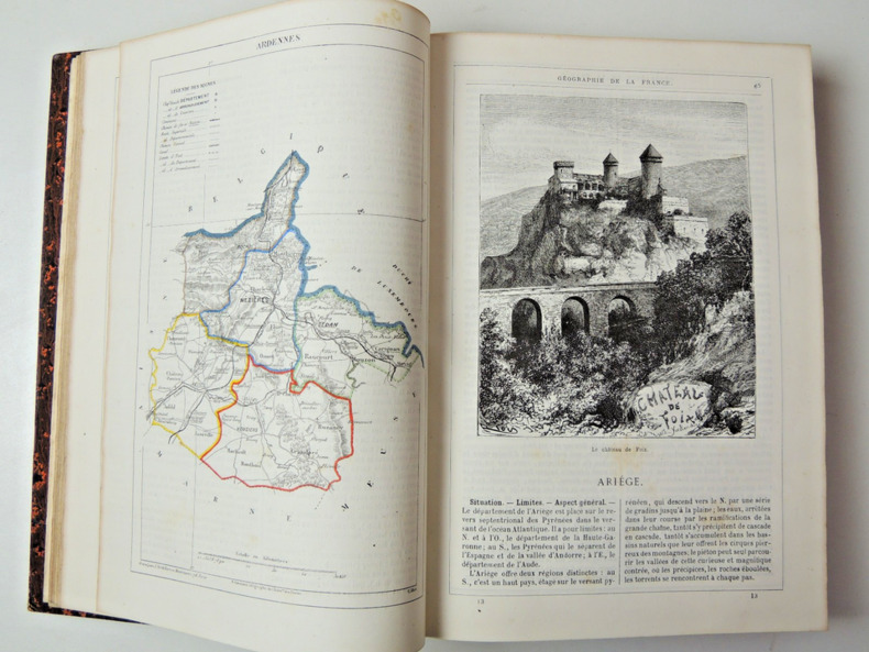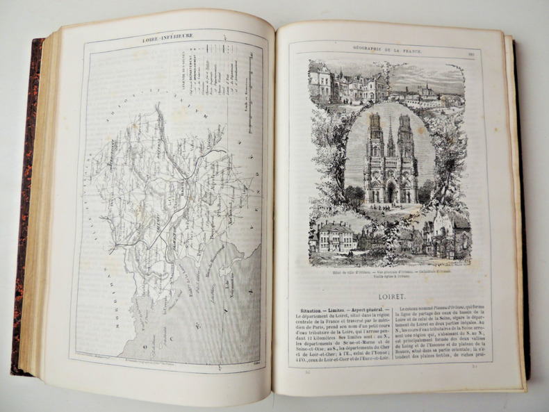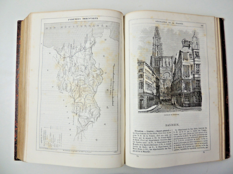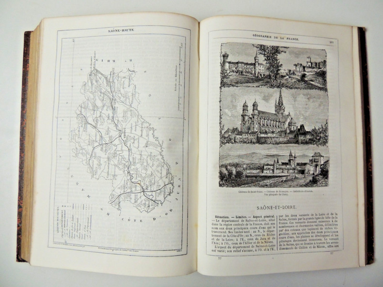 Précédé d'une étude sur la Géographie générale de la France par Théophile LAVALLEE Illustrations par CLERGET et RIOU Cartes par Constans, gravées par Sedille. Illustré d'une carte et d'une vue gravée sur bois par département. Un fort volume , in-4, relié demi-cuir, , frottements, 290x200, , 768 pp, nombreuses illustrations, Paris, J. HETZEL vers 1860 ref/DP