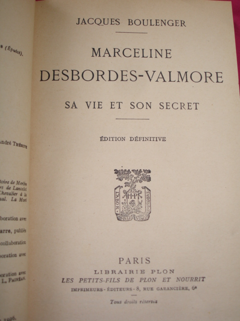MARCELINE DESBORDES-VALMORE sa vie & son secret Jacques Boulenger vol. relié 195x160, superbe reliure demi cuir, 354pp très bel exemplaire ! Paris Plon 1926