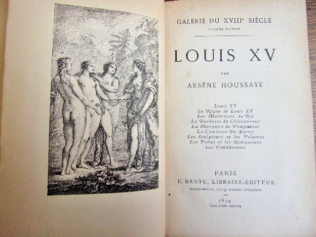 Louis XV, dit « le Bien-Aimé », né le 15 février 1710 à Versailles et mort le 10 mai 1774 dans la même ville, est un roi de France et de Navarre. Membre de la maison de Bourbon, il règne sur le royaume de France du 1ᵉʳ septembre 1715 à sa mort. Il est le seul roi de France à naître et mourir au château de Versailles. Table : Louis XV, le règne de Louis XV, Les maîtresses de Louis XV, La duchesse de Châteauroux, La marquise de Pompadour, La comtesse du Barry, Les sculpteurs et les peintres, Les poètes et les romanciers, Les comédiennes Vol relié demi toile, 180x120, couvertures conservées, parfait état int., 370pp. Collection "Galerie du XVIIIè siècle". Paris, Dentu, 1874 ref/124