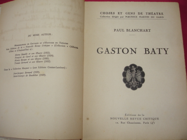 GASTON BATY Paul Blanchard Collection, choses et gens de Théâtre avec envoi de l'auteur ! volume in-8, 190x140, broché, 95 pages, bon état général Paris Nouvelle revue critique D'autres volumes en vente avec envois des auteurs, édition originales, numérotés, ( Daudet, Bloch, Casanova, Tristan Bernard, etc)..