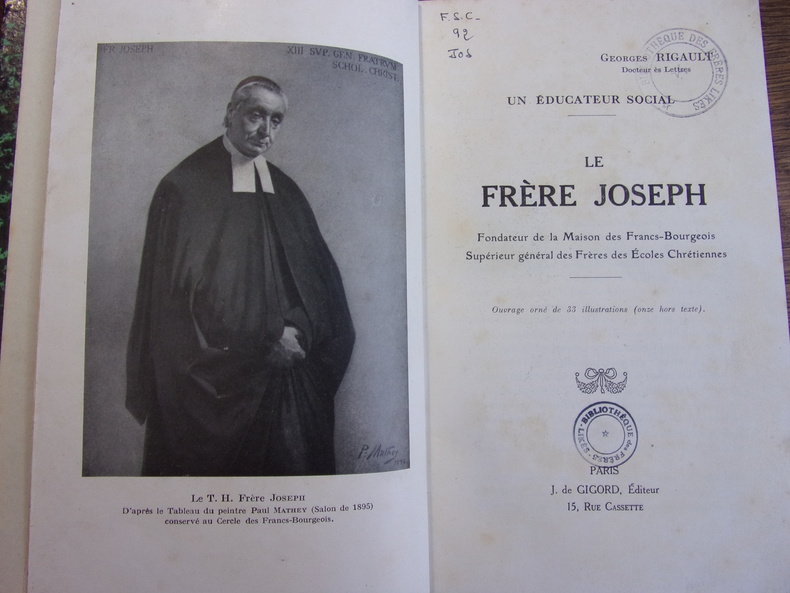 LE FRÈRE JOSEPH Fondateur de la Maison des Francs-Bourgeois, Supérieur général des Frères des Ecoles Chrétiennes Georges Rigault ouvrage orné de 33 illustrations ( 11 hors texte ) vol relié demi toile, 220x140, très bon état intérieur, 334pp. Paris, de Gigord ref/127