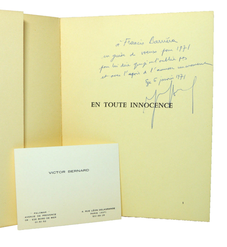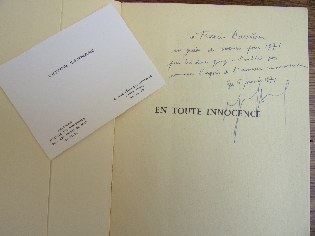 dessin de Jacques Fabrège Bel envoi autographe à Françis Barrière + carte de visite vol broché, 185x140, bel état int. couvertures rempliées, 110pp. Le Cerf Volant 1970 ref/133