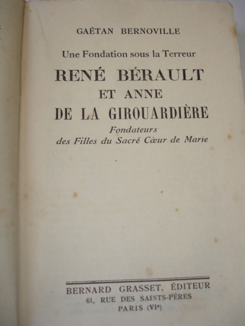 RENÉ BERAULT et ANNE DE LA GIROUARDIERE Fondateurs de l'Institut des Filles du Sacré Coeur de Marie 1728-1794 & 1740-1827 Gaétan Bernoville envoi de l'auteur en première page à Jean Yole Léopold Robert, dit Jean Yole, écrivain et homme politique français.Né à Soullans (Vendée) le 7 septembre 1878, mort à Vendrennes (Vendée) le 2 novembre 1956. Médecin en 1904, il revint exercer à Soullans, dans le marais, et se maria le 23 octobre 1906 avec une fille du bocage, Marie-Joseph Boisdé. Il se baptisa alors Jean Yole pour l'écriture, car ce médecin se déplaçait en yole pour aller voir les malades. Broché, 185 x120, 222pp, bel exemplaire Grasset 1954