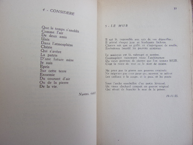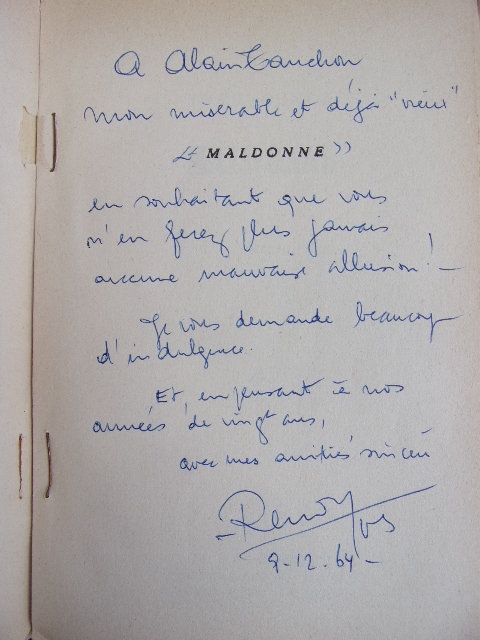 Envoi de l'auteur en page de garde " à Alain Souchon (? ) mon misérable et déjà vieux " Maldonne " en souhaitant que vous n'en ferez plus jamais aucune mauvaise allusion ! Je vous demande beaucoup d'indulgence. Et en pensant à nos années de vingt ans, avec mes amitiés sincères " 9.12.64 " broché, 190x130, 60pp, relié par agrafes, bel état Paris, Les Paragraphes Littéraires, 1959 ref/147