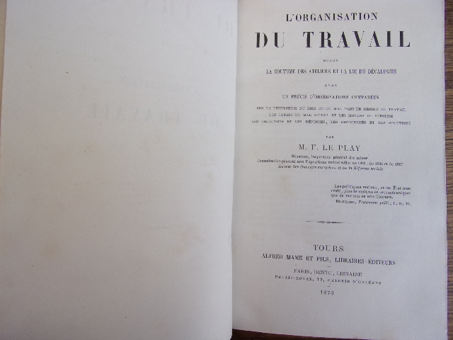 L'ORGANISATION DU TRAVAIL selon la coutume des ateliers et la loi du décalogue, avec un précis d'observations comparées sur la distinction du bien et du mal dans le régime du travail, les causes du mal actuel et les moyens de réforme, les objections et les réponses, les difficultés et les solutions. F. Le Play vol, relié, 180x110, demi cuir, bien frais, très bon état, 561 pages. Paris, Tours, Mame & fils, 1870 ref/168