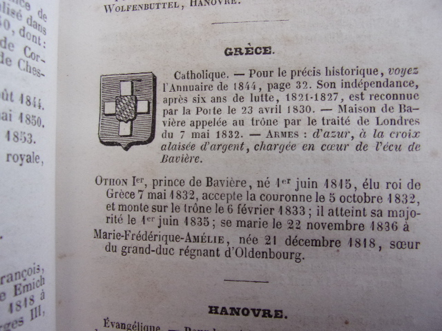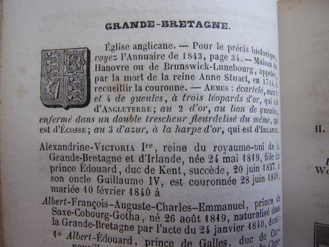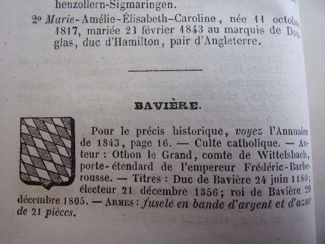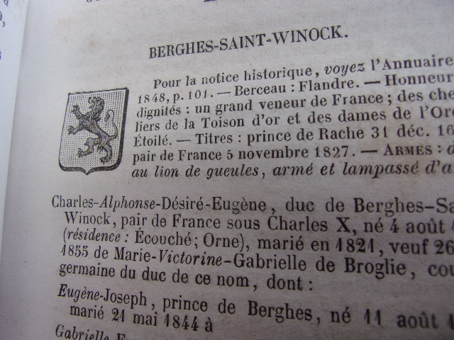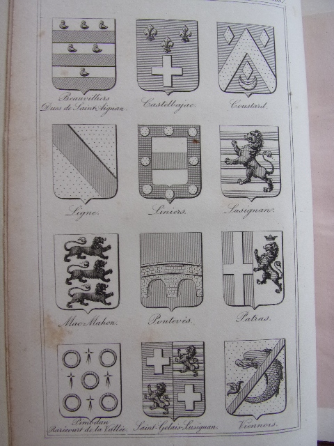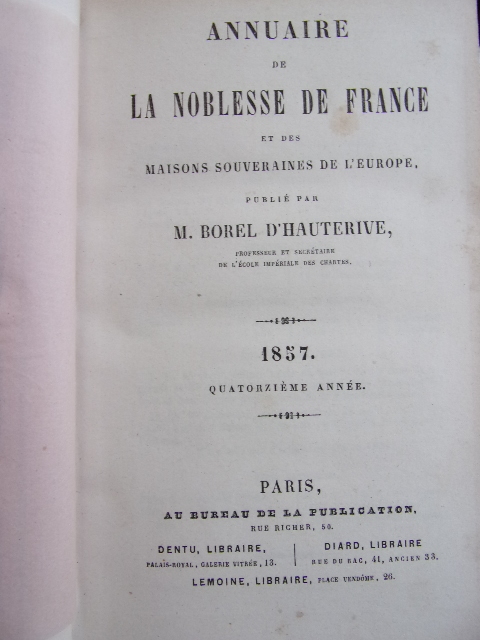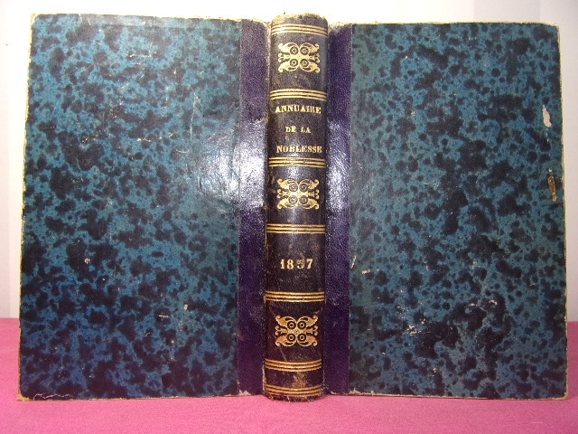 ANNUAIRE DE LA PAIRIE ET DE LA NOBLESSE DE FRANCE 1854 des Maisons Souveraines de l'Europe et de la Diplomatie publié sous la direction de M. Borel d'Hauterive 4 planches de blasons hors texte sous serpente ( dont Nobiliaire d'Artois), Vue du Château de Pommier; blasons et armoiries in texte. vol relié demi cuir, 180x120, frottements, bel état intérieur, 386pp. Paris, Au Bureau de la Publication, et Dentu, Leipzig, Franck, et Berlin, Asher. 1857 D'autres années en vente, groupez les achats !